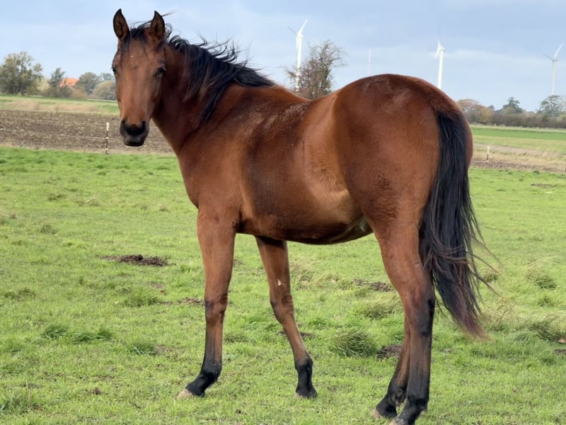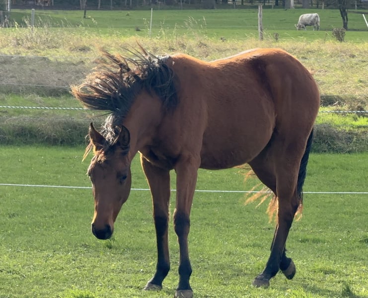Whiz Gunning Melody, nommée Tina, est une jument baie, athlétique, issue du croisement magique TomTom x Gunnatrashya. Tina a grandi en troupeau, elle est à jour de ses vaccinations, régulièrement vermifugée et se comporte bien chez le maréchal-ferrant. Ni les enfants, ni les chiens, ni les tracteurs ne l’effraient, et elle possède un caractère curieux et ouvert. Grâce à ses origines et à son athlétisme, elle possède toutes les qualités nécessaires pour une carrière en reining. Tina se trouve en Nord de l’Allemagne, elle est inscrite auprès de NRHA Germany et nominée pour les compétitions européennes. Pour toute question ou intérêt, je reste à votre disposition.
