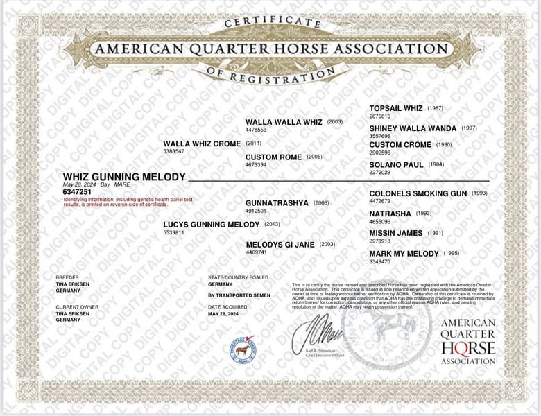Whiz Gunning Melody, known as Tina, is an athletic bay mare sired by the magic-cross TomTom x Gunnatrashya. Tina was raised in a herd environment, is vaccinated, regularly dewormed, and behaves well at the blacksmith. She remains unfazed by children, dogs, or tractors and has a curious and open-minded personality. With her pedigree and athletic ability, she has all the qualities needed for a reining career. Tina is located in Northern Germany, registered with NRHA Germany, and Euro nominated. Please feel free to contact me for further information or if you are interested.