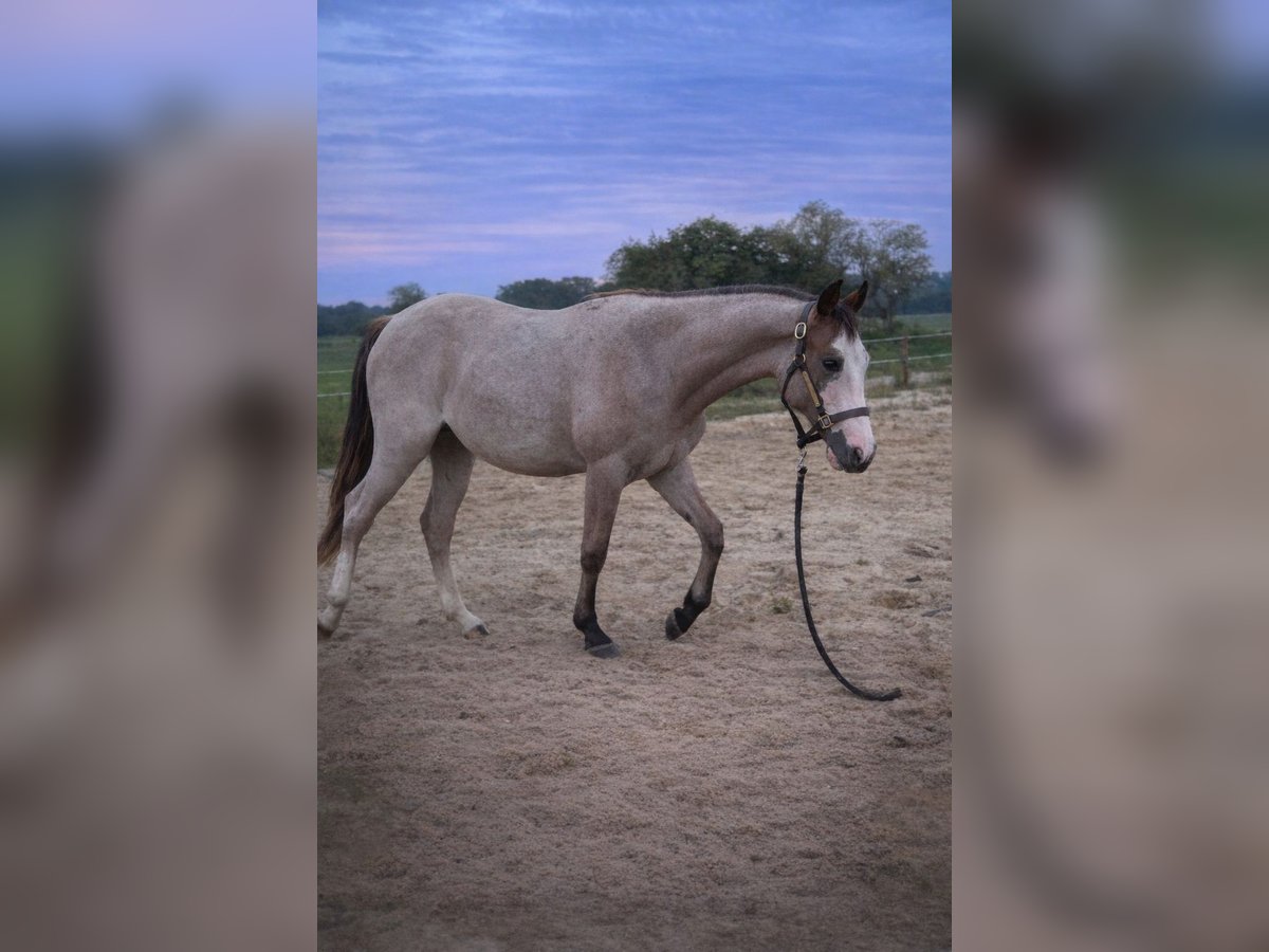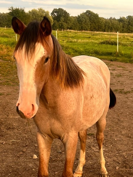 Boons Shining River is a young Quarter Horse mare with Half-Quarter Horse pedigree, born on April 23, 2024. She has a Bay Roan Overo coat and is currently approximately 14.1 hh, with an expected final height of at least 15.3 hh. She impresses with her harmonious conformation, correct posture, and promising proportions, making her a true eye-catcher. In addition to her attractive appearance, she stands out primarily for her gentle, people-oriented character. The mare is calm, relaxed, and approachable, with a gentle and friendly nature. She is well-behaved, uncomplicated, and learns quickly. Boons Shining River is well-trained and consistently pleasant in daily handling. She is healthy, up-to-date on vaccinations, and regularly wormed. She is accustomed to stall and pasture life and has grown up in optimal conditions with plenty of time to develop peacefully. Her care includes high-quality foal feed and good minerals to support her growth. In her current training, she already knows the basics of foal handling, is used as a lead horse in the field, loads easily, and travels in a trailer. She is familiar with human interaction and various everyday situations. On her sire’s side, she has a strong cutting lineage (sire: Redwhiteandblue Boon), combined with excellent riding qualities from her dam’s side. This makes her suitable for both sport and competition as well as leisure riding. Boons Shining River is a young horse with heart and potential for the future, ideal for someone who wants to start with a young horse, guide and develop it from the beginning, and build a true partnership. She is a promising prospect for ambitious riders as well as for caring leisure riders.