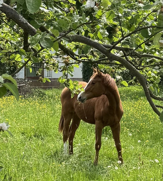 Ganz schweren Herzens muss ich aus persönlichen Gründen meine 1 1/2jährige Quarter Horse Stute abgeben. Sie ist ein absolutes Traumpferd und bringt ihrem Menschen ganz viel Vertrauen entgegen. Sie wird es ihrem Ausbilder ganz leicht machen. Dazu hat sie ganz tolle Bewegungen und einen Charakter aus Gold. Ich gebe sie nur in Hände die dies schätzen und nicht ausnutzen. Sie ist bestens aufgezogen, dementsprechend halfterführig, Tetanus geimpft, regelmäßig entwurmt, Hufe bearbeitet. Bestes Futter, den Sommer auf großen Weiden mit größtenteils Hanglage. Sie wird ein geschätztes Endmass von 1,60 m erreichen. Geht brav auf den Anhänger. Kleine Runden alleine spazieren war sie auch schon. Platz vor Preis, dennoch Preis der Qualität entsprechend. Alles weitere gerne im persönlichen Kontakt, bitte nur ernstgemeinte Anfragen.