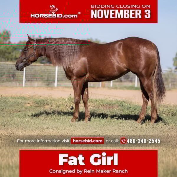 ⚜️𝐓𝐇𝐄 𝐅𝐀𝐋𝐋 𝐇𝐄𝐑𝐈𝐓𝐀𝐆𝐄 𝐂𝐋𝐀𝐒𝐒𝐈𝐂⚜️ Happening now thru MONDAY | NOVEMBER 3rd - Available EXCLUSIVELY on HorseBid's website! For more details and to register visit: www.Horsebid.com CONSIGNOR CONTACT: Rein Maker Ranch 480-340-2545 LOCATION: Wayne, OK BREED: AQHA REGISTERED: Yes REGISTERED NAME: Electrified Britches COLOR: Sorrel HEIGHT: 14.3 AGE: 3 GENDER: Mare ✨ “Fat Girl” – 3-Year-Old Reining Mare ✨ NRHA, NRBC Fat Girl is the kind of young mare everyone hopes to find — kind, consistent, and incredibly steady-minded. She is reining trained and successfully shown at her first futurity this year, proving her ability and composure in the show pen. Despite her age, she’s quiet, forgiving, and takes everything in stride. Nothing phases her, whether it’s new environments, busy arenas, or long show days. She’s got a smooth, correct sliding stop, easy circles, and a naturally stylish way of moving that makes her a pleasure to ride. With her solid foundation and exceptional temperament, Fat Girl would make an outstanding youth, non-pro, or rookie horse, while still having the ability to stay competitive in the show pen. The perfect balance of talent, temperament, and dependability — she’s ready to make someone’s next great partner.