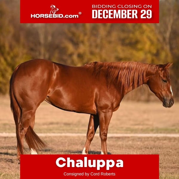⚜️ 𝓗𝓮𝓻𝓲𝓽𝓪𝓰𝓮 𝐖𝐢𝐧𝐭𝐞𝐫 𝓒𝓵𝓪𝓼𝓼𝓲𝓬⚜️ Happening now thru MONDAY | DECEMBER 29th - Available EXCLUSIVELY on HorseBid's website! For more details and to register visit: www.Horsebid.com CONSIGNOR CONTACT: Cord Roberts 940-328-3240 LOCATION: Waco,Tx BREED: QH REGISTERED: Yes REGISTERED NAME: CHALUPAA COLOR: Sorrel HEIGHT: 14 AGE: 3 GENDER: Mare
