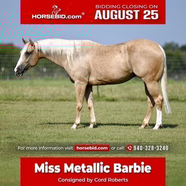 ⭐️ 𝐀𝐔𝐆𝐔𝐒𝐓 𝓐𝓵𝓵 𝓢𝓽𝓪𝓻 𝓛𝓲𝓷𝓮𝓾𝓹 ⭐️ Happening now thru MONDAY | AUGUST 25th - Available EXCLUSIVELY on HorseBid's website! For more details and to register visit: www.Horsebid.com CONSIGNOR CONTACT: Cord Roberts 940-328-3240 LOCATION: Waco,Tx BREED: QH REGISTERED: Yes REGISTERED NAME: MISS METALLIC BARBIE COLOR: Palomino HEIGHT: 14.3 AGE: 4 GENDER: Mare Barbie