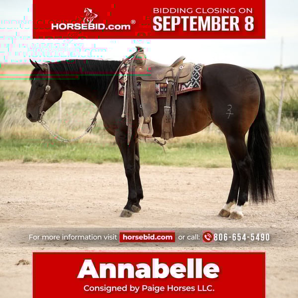 ♦️ 𝐭𝐡𝐞 𝐒𝐞𝐩𝐭𝐞𝐦𝐛𝐞𝐫 𝑺𝒆𝒍𝒆𝒄𝒕 ♦️ Happening now thru MONDAY | SEPTEMBER 8th - Available EXCLUSIVELY on HorseBid's website! For more details and to register visit: www.Horsebid.com CONSIGNOR CONTACT: Paige Horses LLC. 806-654-5490 LOCATION: Amarillo, TX BREED: Quarter Horse REGISTERED: Yes REGISTERED NAME: COWANS HOT CHIC COLOR: Bay HEIGHT: 15 AGE: 4 GENDER: Mare Talk about a jaw dropper! Annabelle is big, beautiful, and BROKE! Coming in at the ripe age of 4, Annabelle will get in your eye, but hasn’t just been the “pretty girl”. She’s been in the best of hands her entire riding career that knows how to put the stuff on one AND make it stick! Coming from a tremendous reined cowhorse program, Annabelle has the mechanics and athleticism to go any direction. Are you looking for your next Ranch Riding prospect? Here she is…pure cadence at all gaits! Have you been on the hunt for a rope horse prospect? She’s gritty, cowy, and LOVES to drag a hind leg! Tired of driving all over looking at horses that have been tip toed around or never been asked for anything? Don’t you worry, Anna has had the pressure poured all over her. She steps to the plate eager and happy to learn every day. While at the trainers, she was often ridden by a very novice showman. Annabelle helped her learn how to ask one for lead departures, spins, stop, and how to box a cow. She will twirl like a top, has automatic leads, and can STOP…naturally! Both hocks hit the ground, her front end breaks loose, and does it with no tension on the reins. Since she’s been with us, we have used her in our feedyard a little and we’ve started pen roping calves on her. She will track one around effortlessly, doesn’t cover up cattle, and reads cattle a mile away. She’s been started on the smarty and we could see her having a big future as a head horse. She’s a fancy gal! Not only does she have the ability, she’s got size! Annabelle was bred, raised, and proudly packs the Zieman Ranch brand. Ted Zieman has raised several futurity and derby winners, but he has also maintained what the ‘cowboys’ need, through his breeding program. One with size, bone, foot, cow sense, athleticism, pedigree, and work ethic! Annabelle’s pedigree wasn’t developed over night, but with decades of knowledgeable breeding intentions. Annabelle’s sire COWANS POCO COWBOY goes back to the legendary PAT COWAN who has been a staple in multiple disciplines across the entire Quarter Horse industry. Her dam, SMOKIN HOT CHIC 104, is a money earner and was the 2016 HPRBA Reserve Open Futurity Champion herself. She has produced several money earners and continues to be a top producer for the Zieman Ranch. Annabelle would also make an extremely nice broodmare if you’re in the breeding industry. With her pedigree, size, and confirmation, you could cross this mare on a Jack donkey and still get a pretty mule! She is the ultimate outcross on any sire. Annabelle stands a full 15 hands tall and weighs 1200 lbs. She’s big hipped, keen headed, straight legged, and has a gigantic mane and tail. She doesn’t have a single hair out of place and isn’t marish whatsoever. Great ground manners, no bad habits or quirks, and is ready to finish however you choose. Sells 100% sound in every way. Annabelle is located in Amarillo, Tx. We can help line up a hauler anywhere across the nation. PPE’s gladly welcomed at potential buyers’ expense. For more information call or text Taylor at 806-654-5490.