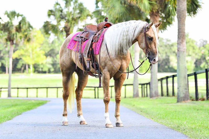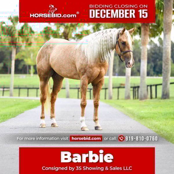 🎄𝐓𝐇𝐄 𝑯𝒐𝒍𝒊𝒅𝒂𝒚 𝐂𝐋𝐀𝐒𝐒𝐈𝐂🎄 Happening now thru MONDAY | DECEMBER 15th - Available EXCLUSIVELY on HorseBid's website! For more details and to register visit: www.Horsebid.com CONSIGNOR CONTACT: 3S Showing & Sales LLC 919-810-0760 LOCATION: Ocala FL BREED: AQHA REGISTERED: Yes REGISTERED NAME: PEPPYS FOOLISHDANDEE COLOR: Palomino HEIGHT: 16 AGE: 3 GENDER: Mare Meet Barbie Coming 4 year old AQHA registered mare. Barbie is a stunning palomino with a dappled golden coat and big, kind eye that turns heads everywhere she goes. She’s eligible for Palomino papers if you’d like to double register her! You can go show in the Open Shows, USEF shows, AQHA, and Palomino. Barbie has done everything (and more!) that a young horse should. She’s started a lovely turn on the haunches, moves off the leg beautifully, and handles obstacle courses with ease. She’s gone cross-country over logs, ditches, and banks, and walks right into the water without hesitation. She’s confident down busy roads in traffic and has been shown successfully with a 10-year-old rider. ✨ Undefeated in Hunter Hack, Barbie has won every single WTC Hunter Hack class she’s entered — even with a 10-year-old rider! She’s been shown indoors, outdoors, and rides in our large open fields, taking it all in stride. She’s been exposed to just about everything: loud bullwhips, tarps, cows, bridges, deer, dogs, and big trucks. 🏆 Show Ring Experience: English Pleasure, Pattern Classes, and Hunter Hack. We also think she’d make a super fun Ranch Riding or All-Around prospect thanks to her laid-back, willing attitude. Her fancy, fluid movement will absolutely turn heads in the Hunter Ring. What I love most about Barbie, coming from the show world, is that she will happily frame up in the bridle or drop the reins and go “long and low.” Barbie is more “whoa” than “go,” but she’s never lazy — she has a perfect natural rate and a great brain. She loads, ties, cross-ties, and stands quietly at the trailer with no fuss. Barbie is an easy keeper. She’s barefoot, sound, and requires zero maintenance. This gorgeous young mare truly checks every box: looks, movement, mind, and heart. We’ve loved having her in our program, and it’ll be bittersweet to see her go. Barbie has been exposed to so many different experiences and is ready for someone to finish her out in their chosen discipline and keep her winning streak going! So come feel like a Barbie girl and live in Barbie’s world! UTD on Coggins, Wormer, Vaccines, Teeth, and Farrier.