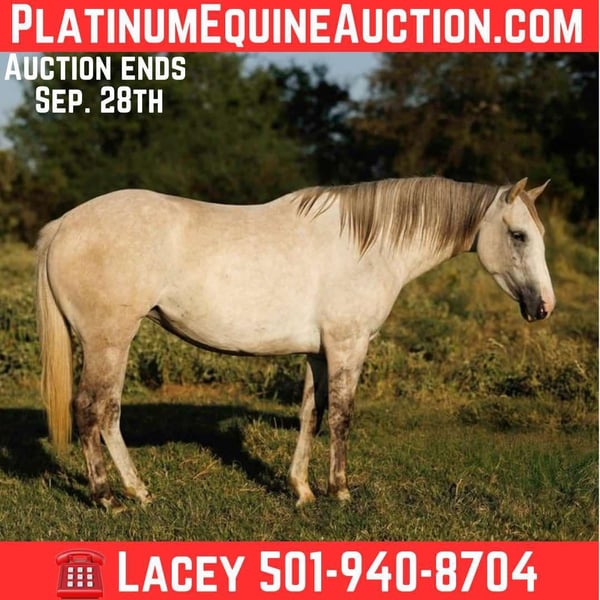 ONLINE AUCTION Place your bids at www.PlatinumEquineAuction.com Starting Bid $3500 Auction ends September 28th, 2025 Need a new saddle? Check out White Rock Saddles on our website or Facebook Snowflake is a four-year-old grey dun mare standing a handy 14 hands, and she’s every bit as striking as she is talented. With her soft grey coat, bold dorsal stripe, and tiger-striped legs, she has that classic dun factor that makes her stand out in any pen. She’s balanced, shapey, and feminine, with a bright, intelligent eye that reflects both style and sensibility. Despite her young age, Snowflake rides with a maturity well beyond her years. She crosses water and rough terrain without hesitation, catches both leads with ease, and stays soft and collected in the bridle. Her turnaround is snappy and her stop is deep and willing. She really wants to cat around — reading and following her rider with that catty, quick-footed feel. She even rides bridleless and bareback, proving her honesty and willingness no matter how you throw a leg over her. She’s been used at the sale barn, giving her valuable real-world exposure, and she watches a cow naturally and with plenty of feel. Easy to catch, saddle, bridle, haul, and handle, she’s as straightforward and user-friendly on the ground as she is in the saddle. There’s no fuss, no guesswork—just a filly who has the handle, knowledge, and try of a seasoned mount. She’s “really nice” doesn’t even do her justice; she’s downright exceptional. Snowflake is the full package: the kind of filly that’s sharp, stylish, and smart, yet quiet and trustworthy. At just four years old, she’s already the kind that can go in any direction — whether that’s the ranch, the arena, or the trail — and excel while looking good doing it. Willing, capable, and loaded with ability, Snowflake is a young mare with a bright future ahead of her. Located in Quitman, AR. Call Lacey Wilf 501-940-8704 with any questions. ONLINE AUCTION Place your bids at www.PlatinumEquineAuction.com Starting Bid $3500 Auction ends September 28th, 2025 Need a new saddle? Check out White Rock Saddles on our website or Facebook