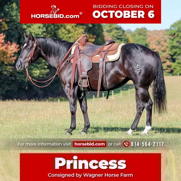 🍂 𝓐𝓾𝓽𝓾𝓶𝓷 𝑨𝑳𝑳 𝑺𝑻𝑨𝑹 𝑳𝑰𝑵𝑬𝑼𝑷 🍂 Happening now thru MONDAY | OCTOBER 6th - Available EXCLUSIVELY on HorseBid's website! For more details and to register visit: www.Horsebid.com CONSIGNOR CONTACT: Wagner Horse Farm 814-564-2117 LOCATION: Clarion, PA BREED: QH REGISTERED: Yes REGISTERED NAME: KJ Leo Black Pine COLOR: Black HEIGHT: 14.1 AGE: 4 GENDER: Mare KJ Leo Black Pine or as we call her around the barn Princess is a Registered American Quarter Horse Super Good Looking Black Mare. If your looking for a super classy and good looking but also super quiet and gentle horse that also rides very good then Princess is exactly that! Princess can go in any direction! She is a great trail horse. Has been used to push cattle around the farm and also rides nicely in the arena . The skys the limit for this good aged mare. She goes anywhere you ask her to go on the trail and is very quiet and level headed. Nothing phases her or bothers here. She is very reliable and seasoned beyond her years. Very friendly and loves attention. She is the kind of horse that is easy to bond with . Good for the farrier and vet. Princess is very easy!! Just saddle her up and go enjoy a nice relaxing ride. She will ride laid back and quiet or if you want to go do a job she will get up and go when asked. She always rides off quiet and is good with time off. Call or Text Glory at 814-564-2117. We can help arrange delivery anywhere in the United States. Thank You and God Bless