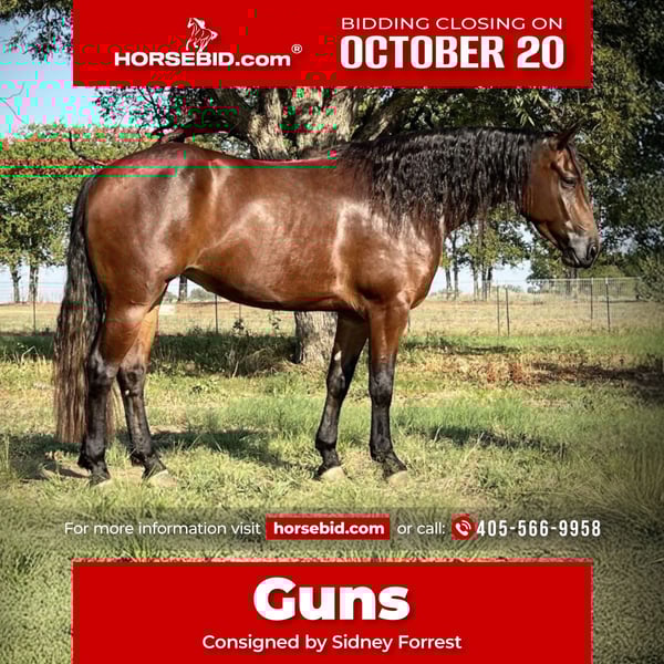♦️ 𝐭𝐡𝐞 𝐀𝐌𝐄𝐑𝐈𝐂𝐀𝐍 𝓕𝓪𝓵𝓵 𝓒𝓵𝓪𝓼𝓼𝓲𝓬 ♦️ Happening now thru MONDAY | OCTOBER 20th - Available EXCLUSIVELY on HorseBid's website! For more details and to register visit: www.Horsebid.com CONSIGNOR CONTACT: Sidney Forrest (405)566-9958 LOCATION: Lipan TX BREED: AQHA REGISTERED: Yes REGISTERED NAME: WINDYGUN CHRISTIE COLOR: Bay HEIGHT: 15 AGE: 4 GENDER: Mare Windygun Christie 2021 Bay Mare by: Julgun (Playgun) and out of a Topsail Wiz dam. “Guns” is a super nice 4 yr old. She is built right and ready to go! She was started in the heeling by Dillon Graham NFR Qualifier. She is super easy to ride, never gets hot or unwilling, really broke and behind the bridle. Same trip everytime. She has no quirks or bad habits. Would work for any level roper. She is very gentle, has never bucked or done anything bad. You can ride her bareback with a halter. Big beautiful tail, and it’s real! You won’t find a better filly this age. She would be an excellent addition to someone’s breeding program as well, just take a look at her papers! Top side -> Her sire Julgun (Lifetime earnings over $50,000) is a NRBC Open Derby Champion; Multiple Open Futurity and Derby Finalist; Two Time AQHA World Show Qualifier Top Ten Junior Reining etc. Julgun is by Playgun (Lifetime earnings $186,000 and 21 event championships. He was the National Cutting Horse Association's top money-earning 4-year-old cutting horse. And his offspring have won over $9 million! Bottom side-> Topsail Whiz, left a lasting impact on the sport. He was the first reining sire to surpass $12 million in progeny earnings, and his daughters' offspring have won over $9 million!! We are only selling Guns to slim down our herd while we are building our property. She has never been sick or injured. Has great feet and is clean legged. Pre-purchase exams are more than welcomed at buyers expense. Located in Lipan TX (405)566-9958