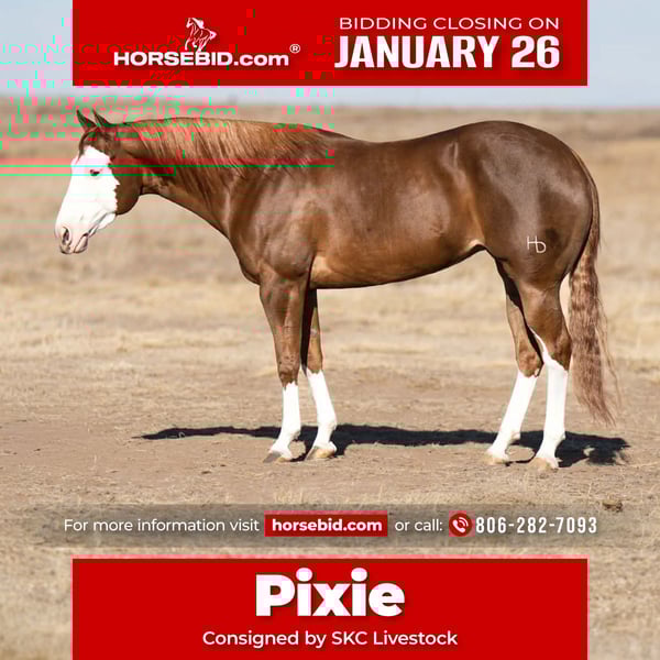 𝐉𝐀𝐍𝐔𝐀𝐑𝐘 ⭐️𝑨𝒍𝒍 𝑺𝒕𝒂𝒓 𝑳𝒊𝒏𝒆𝒖𝒑⭐️ Happening now thru MONDAY | JANUARY 26th - Available EXCLUSIVELY on HorseBid's website! For more details and to register visit: www.Horsebid.com CONSIGNOR CONTACT: SKC Livestock 806-282-7093 LOCATION: Canyon, TX BREED: Quarter REGISTERED: Yes REGISTERED NAME: A Brown Eyed Girl COLOR: Sorrel HEIGHT: 15 AGE: 6 GENDER: Mare Allow us to introduce A brown eyed girl aka Pixie a gorgeous, double registered sorrel mare that has been successfully shown and has won money in the ranch classes. She has all the chrome and eye appeal you could possibly put on one and to top it off she was raised by Hilldale farm. Pixie is sired by Heavy Duty Chex earner of over 140k and out of a daughter of the great Colonels Smoking Gun. Pixie is a beautiful mover and is broke to death. She has a stylish long trot, a nice jog and she circles pretty. This flashy lady spins both directions side passes both ways and is light in her face and says soft as butter. This is a horse you can leave off for any amount of time and not have to worry about she will stay the same quiet, kind and gentle ride on even the coldest stays. Pixie is an old soul and has been a favorite for our little ones and the more novice riders around our barn. We have rode Pixie outside extensively to both trail ride and to gather cattle, she crosses water, and rocky terrain with ease, she’s even quiet and safe to ride through our busy little town. Pixie has no spook or bad habits and is extremely versatile. We have tried hard to find her limits and just never seem to, she has a huge heart and a tremendous amount of try. We have rode her everyday possible, bareback, double, triple, English western heck we have even used her to pony some colts she never tells you no. Pixie has a sweet personality she likes people and likes attention but still has the perfect manners. This is truly a dream horse, please call us with any questions.
