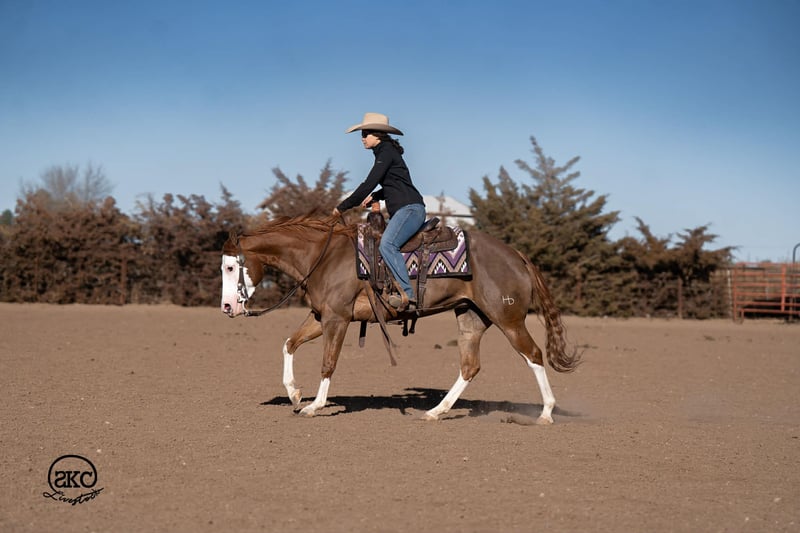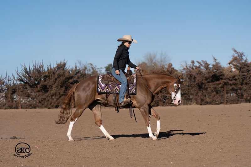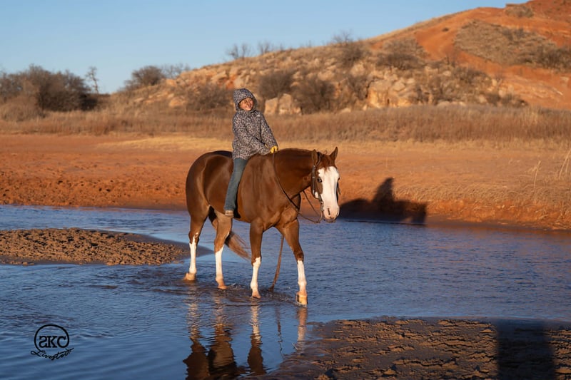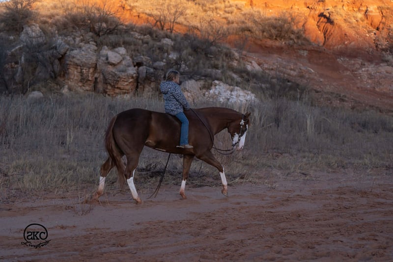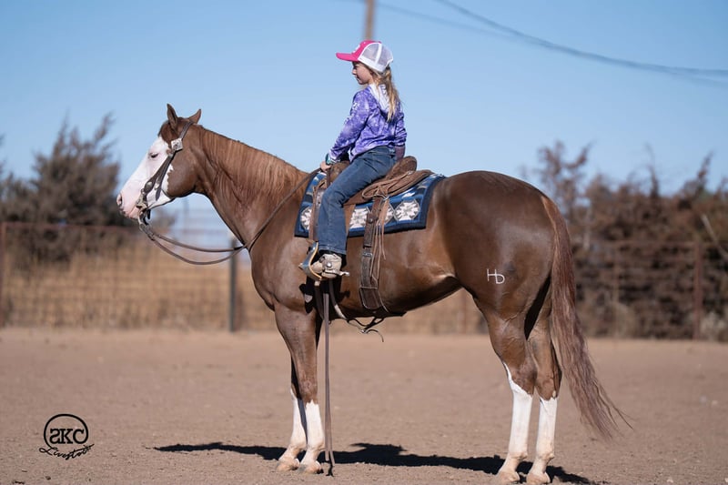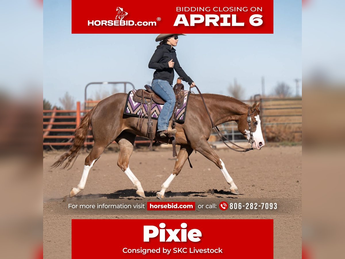 🌟𝑨𝒑𝒓𝒊𝒍 𝐀𝐋𝐋 𝐒𝐓𝐀𝐑 𝐋𝐈𝐍𝐄𝐔𝐏🌟 Happening now thru MONDAY | APRIL 6th - Available EXCLUSIVELY on HorseBid's website! For more details and to register visit: www.Horsebid.com CONSIGNOR CONTACT: SKC Livestock 806-282-7093 LOCATION: Canyon, TX BREED: Quarter Horse REGISTERED: Yes REGISTERED NAME: A Brown Eyed Girl COLOR: Sorrel HEIGHT: 15 AGE: 6 GENDER: Mare Allow us to introduce, A Brown Eyed Girl aka Pixie a gorgeous, double registered sorrel mare that has been successfully shown and has won money in the ranch classes. She has all the chrome and eye appeal you could possibly put on one and to top it off she was raised by Hilldale Farm. Pixie is sired by Heavy Duty Chex earner of over 140k and out of a daughter of the great Colonels Smoking Gun. Pixie is a beautiful mover and is broke to death. She has a stylish long trot, a nice jog and she circles pretty. This flashy lady spins both directions side passes both ways and is light in her face and says soft as butter. This is a horse you can leave off for any amount of time and not have to worry about she will stay the same quiet, kind and gentle ride on even the coldest stays. Pixie is an old soul and has been a favorite for our little ones and the more novice riders around our barn. We have rode Pixie outside extensively to both trail ride and to gather cattle, she crosses water, and rocky terrain with ease, she’s even quiet and safe to ride through our busy little town. Pixie has no spook or bad habits and is extremely versatile. We have tried hard to find her limits and just never seem to, she has a huge heart and a tremendous amount of try. We have rode her everyday possible, bareback, double, triple, English western heck we have even used her to pony some colts she never tells you no. Pixie has a sweet personality she likes people and likes attention but still has the perfect manners. This is truly a dream horse, please call us with any questions.
