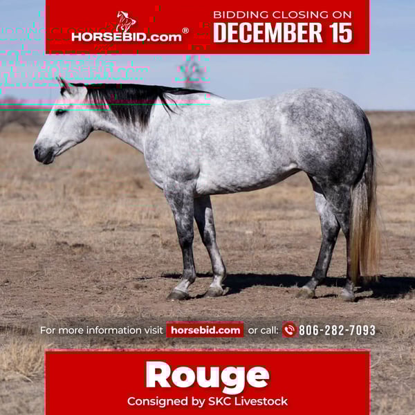 🎄𝐓𝐇𝐄 𝑯𝒐𝒍𝒊𝒅𝒂𝒚 𝐂𝐋𝐀𝐒𝐒𝐈𝐂🎄 Happening now thru MONDAY | DECEMBER 15th - Available EXCLUSIVELY on HorseBid's website! For more details and to register visit: www.Horsebid.com CONSIGNOR CONTACT: SKC Livestock 806-282-7093 LOCATION: Canyon TX BREED: AQHA REGISTERED: Yes REGISTERED NAME: Cats LIL Majorette COLOR: Grey HEIGHT: 14.3 AGE: 6 GENDER: Mare "This stunning dapple grey, 14.3-hand registered QH mare is the complete package—beautifully built, great-minded, and backed by real ranch experience. At just 5 years old, Rouge carries herself with the maturity and reliability of a seasoned veteran. She’s shapey, balanced, and made to work all day with a willing, honest attitude. Rouge has been used extensively on a working ranch and in the feedlot, giving her a true foundation—checking pairs, sorting, shipping, doctoring, dragging calves, and gathering rough country. She’s seen big, tough terrain including Palo Duro Canyon and the rough country of New Mexico, always staying sure-footed and confident. She has also been hauled to ranch gatherings and brandings and has packed novice riders in real working situations without issue. She has no vices and carries excellent ground manners, making her easy and enjoyable to have in the barn. Extremely Cowy & an Outstanding Sorting Horse Rouge is naturally cowy—quick, gritty, and sharp about reading one. She has excellent rate, stays true in front of a cow, and refuses to let anything slip past her. With her responsiveness, deep stop, and good face, she shines in both ranch sorting and team sorting. She’s the kind you can haul overnight and be competitive on immediately. Finished Head Horse — Ready to Haul & Win Rouge is a solid, finished head horse that scores well, leaves flat, runs to the hip, and handles cattle clean and correct every trip. She’s consistent, user-friendly, and has all the tools to go win. Whether jackpotting, entering ranch rodeos, or hauling to local ropings, she is ready to go to work today. Gentle, Dependable, & User-Friendly Rouge is straightforward and uncomplicated. She hauls with mares or geldings, stands tied quietly, never acts mare-ish, and stays gentle even with time off. She crosses water, handles rough terrain, and is traffic and machinery safe—feed trucks, loaders, tractors, four-wheelers, etc. Nothing rattles her, and she shows zero spook or silliness. If you’re looking for a versatile ranch horse, a competitive sorting horse, and a finished head horse ready to haul and win, Rouge checks every box. She is genuinely a nice mare—honest, broke, safe, and extremely capable."