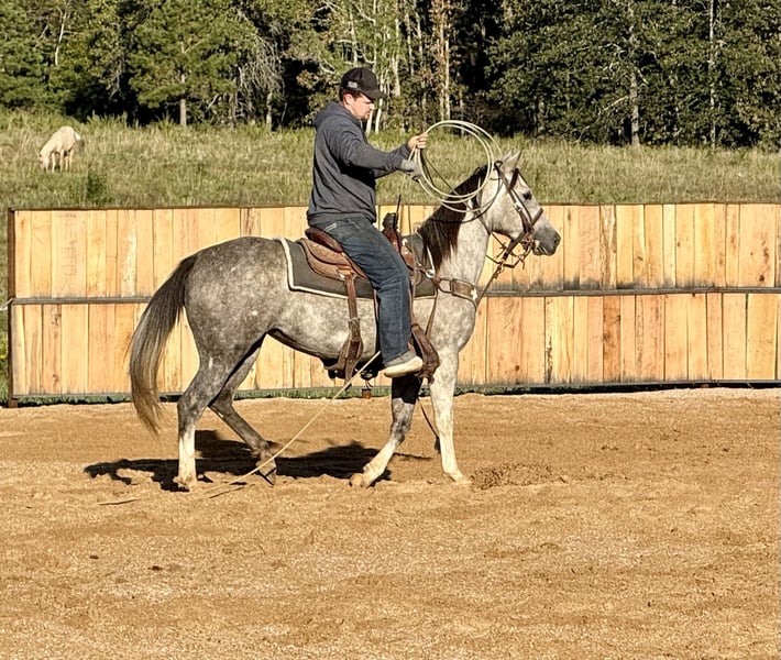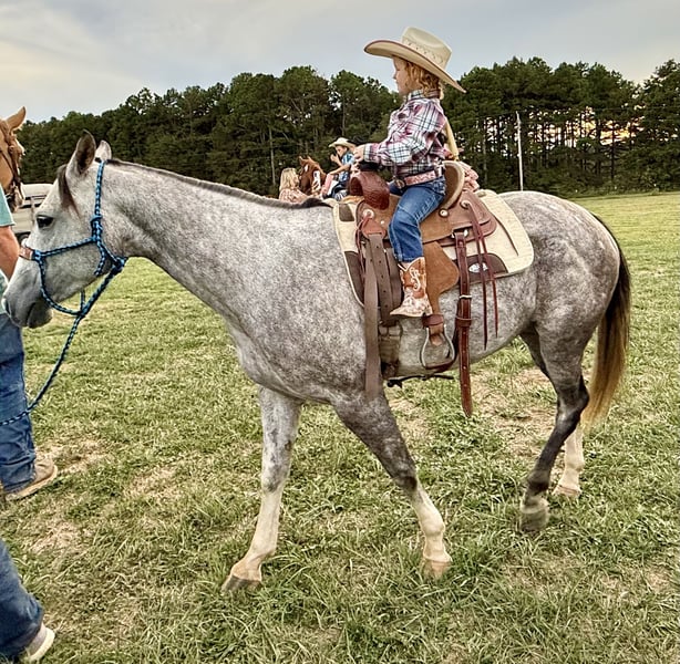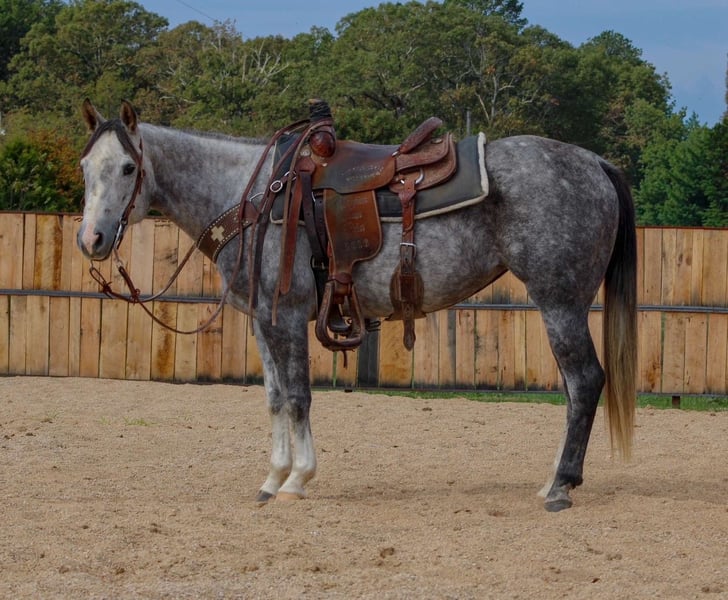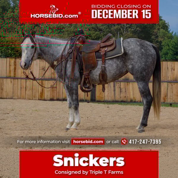 🎄𝐓𝐇𝐄 𝑯𝒐𝒍𝒊𝒅𝒂𝒚 𝐂𝐋𝐀𝐒𝐒𝐈𝐂🎄 Happening now thru MONDAY | DECEMBER 15th - Available EXCLUSIVELY on HorseBid's website! For more details and to register visit: www.Horsebid.com CONSIGNOR CONTACT: Triple T Farms 417-247-7395 LOCATION: Summersville, MO BREED: Quarter Horse REGISTERED: Yes REGISTERED NAME: PG Sixbee 1178 COLOR: Grey HEIGHT: 14.2 AGE: 7 GENDER: Mare Meet Snickers, our stunning 7 year old 14.2 registered grey mare! What's not to love? She’s not just beautiful; she’s got the drive and heart to take on anything you throw her way. Snickers is making fantastic progress heeling cows and breakaway roping. She’s been a star at local rodeos—always delivering great performances. She’s got a smooth neck rein and is quick to respond to cues and pressure. With her excellent ground manners, my son took her to a local horse show and brought home a nice ribbon in the halter class, while my daughter came home with the trophy in the lead line! She’s very easy to handle, the kids take her in and out of the stalls alone and ties her up without any issues. She’s traveled far and wide across our state and beyond for rodeos and trail rides. No matter the terrain, Snickers tackles it all with confidence and poise. She is traffic and pet safe. She will ride out alone or with others and doesn’t make a fuss to be the leader. We have used her to pony other horses, both during trail rides and in town. She stands beautifully for the farrier and adores the kids who love giving her baths and brushing her.