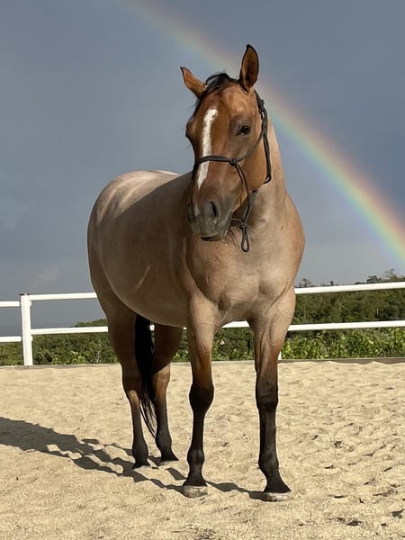 GOTTA BOONBOON DAISY Quarter Horse mare, dun/red roan, 7 years old, born on May 28, 2018 Mare: Smart Spirthly Dunit x Sire: Gotta West Coast Gun Height: approximately 148 cm Panel: 5 N/N negative Regularly dewormed and vaccinated Lodging: currently stabled with a muddy paddock and summer pasture in herd management Farrier- and loading-friendly, currently barefoot Training: Raised and trained by breeder Ariane Lixl until 2.5 years old, 5 months under professional rider Karo Kirchl from about age 3, riding lessons, groundwork course, spook training Due to lack of time after the birth of my child, I have to part with my horse, and I am looking for a lifelong home for her. Daisy has a loving character. She is friendly, fearless, human-oriented, and eager to learn. She is an absolute reliable partner and a calming presence, whether on rides alone or with company, or during training. In training, Daisy always strives to do everything correctly and is motivated during work. She also has a good grasp of things and a clear mind; she usually quickly understands what is expected of her. When riding, Daisy gives the rider a good feeling, not only through her movements. Since she is still young, she needs a confident and experienced riding partner by her side. She is sensitive and refined in handling. When given treats (apple, carrot, etc.), she may start to crib, but she can be easily distracted or diverted with other stimuli. However, with ideal care, feeding, and workload, she shows hardly any tendencies for this. This has been checked by a veterinarian, who found no health issues. Nevertheless, Daisy is a reliable leisure partner with a wonderful character and a true four-legged life insurance. In consultation, some riding equipment (Diamond C saddle, bridle, blanket, etc.) can also be purchased. Location: 3482 Stettenhof, Austria Price: VB 13.🥕🥕🥕 (negotiable) More info gladly via private message!