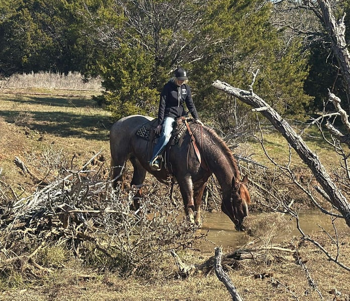 ONLINE AUCTION Place your bids at www.PlatinumEquineAuction.com Starting Bid $3500 Auction ends February 3rd, 2025 Need a new saddle? Check out White Rock Saddles on our website or Facebook! Merlot is a beautiful red roan mare standing 16.2 hands tall with enough mass to pull a house down. We normally call horses like her the perfect beer drinking horse but this mare is so classy we call her a wine drinking horse. Merlot is a sweet mare that is gentle and kind. She lowers her head to be haltered and bridled. She saddles up like a lady every day and is the perfect mount to jump on and go down the trails, or hook up and drive to town. She will cross all the obstacles we have found including water, logs, brush, and mud and will go up and down even the toughest of terrain with sure footedness. She will lead, follow, or go out on her own. She loads and unloads with ease and stands tied. Merlot will stand at the mounting block, cross tie, and is good stalled or turned out. We have never seen her show any mare tendencies. She is barefoot and sound with clean/straight legs. She is a stunning mare with chrome and mass that you have to see in person to appreciate! FMI call/text Holland Horse Co Chanel 559-978-6320. We are happy to answer questions, schedule a test ride, or help arrange shipping nationwide! Located in Jacksboro, TX. ONLINE AUCTION Place your bids at www.PlatinumEquineAuction.com Starting Bid $3500 Auction ends February 3rd, 2025 Need a new saddle? Check out White Rock Saddles on our website or Facebook!