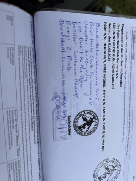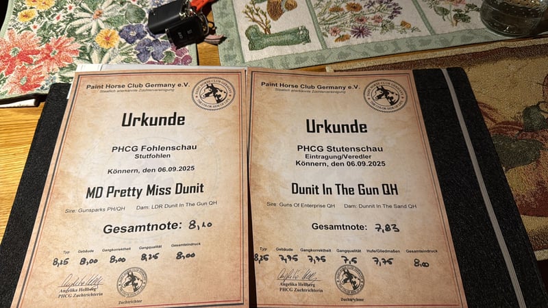 Am 11.03.2025 wurde Margie geboren. Margie ist ein American Quarter Horse Stutfohlen in Bay, doppelt registriert Sir: GUNSPARKS (Gunners Crome Sun) Dam: LDR DUNIT IN THE GUN (Guns of Enterprise) Stutbuch I Prämienstute PHCG Sieger Stutenschau Stutbuch II Prämienstute DQHA Sieger Stutenschau Teilnehmer Bundesstutenchampionat - 2. Platz Sie ist korrekt gebaut, zeigt athletischen Bewegungen und ist Reining + Allround gezogen. Sie wächst in einer liebevollen Hobbyzucht im Herdenverband auf, kennt bei Abgabe Hunde, Traktoren, Schmied, Tierarzt und 24 Stunden Koppel. Margie hat partiell blaue Augen. Sie ist 7 Panel N/N getestet. Bei Abgabe besitzt Sie ein DQHA Pass und ein AQHA / APH Papier. - weiterhin sie über Laboklin für Lethal White Overo (LWO) und Splashed White N/N getestet Sie erlernt das Fohlen 1×1 und wird nach dem Absetzen ab Oktober in ein gutes Zuhause abgegeben. Unsere Pferde erhalten hochwertiges Futter was sie bei einer optimalen Versorgung von Sehnen, Gelenken und Knochen unterstützt. Margie ihre Halbschwester steht ebenfalls zur Besichtigung. Margie wurde zur Paint Horse Fohlenschau am 06.09.2025 in Könnern vorgestellt. Hier konnte sie mit ihrem athletischen Gang und perfekt bemuskeltem Body überzeugen und erhielt die Wertnote 8,10. Somit ist sie 1a Prämienfohlen. Sie wurde 2. in der Klasse der Stutfohlen und war 2 bestes Fohlen von 18 der gesamten Fohlenschau. Wir wünschen uns für Margie ein 5- Sterne zu Hause, nach Möglichkeit mit Förderung im Sport. Für näheres sowie Bilder/Videos gern melden, Am besten persönlich vorbeikommen und sie kennenlernen. 015151173110