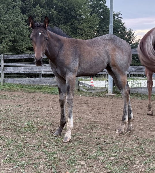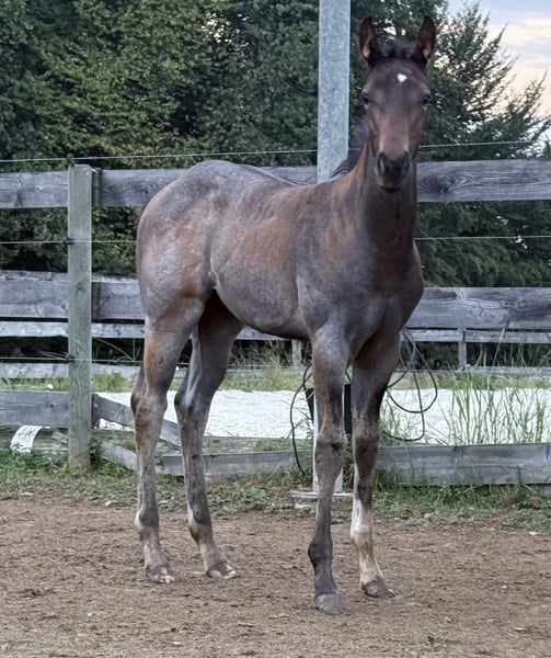 SuddenChocolateGrace alias Gracy 2025 AQHA-Stutfohlen in bay-roan Vater:Chocolate After Dark Mutter: HC A Secret Sudden Allround-Prospect! CHOCOLATE AFTER DARK ist Reserve-Europachampion und Deutscher Champion. Er beeindruckt mit einem großartigen Exterieur und dem besten Verstand, den man sich wünschen kann. Mit nur vier Fohlenjahrgängen ist "Elvis" bereits Vater eines Europachampions, Reserve-Europachampions und Futurity-Champions! HC A SECRET SUDDEN stammt von dem legendären RL Best Of Sudden (man muss ihn nicht vorstellen) und aus ALotta good Scotch. Ihr Vater ist ebenfalls der legendäre Zippos Mr Good Bar! Beste Linien vereinen sich in unserem herausragenden Stutfohlen! Gracy ist wirklich einmalig! Dieses Stutfohlen ist TALENTIERT. Sie kombiniert ein korrektes Exterieur mit einem flachen Vorderbein, ihr liebes und offenes Wesen sowie ihre besondere Farbe in bay-roan ist sie auf jeden Fall ein besonderer Eyecatcher! Sie perfekt für zukünftige Amateur-, Jugend- sowie Open-Klassrn. Sie lernt gerade das Fohlen-ABC was auch Anbinden, Scheren, Verladen und waschen beinhaltet. Erst showen- dann züchten - Gracy wird sicherlich eines Tages eine hervorragende Zuchtstute abgeben. Sie ist vereint bestes Pedigree, Körper, Charakter und Farbe! Gracy wird nur an ein liebevolles und geeignetes Showzuhause verkauft! Sie befindet sich im Süden Österreichs - Steiermark! Schrotter Quarter-horses kontaktieren Sie mich via Facebook,Insta oder Telefon;