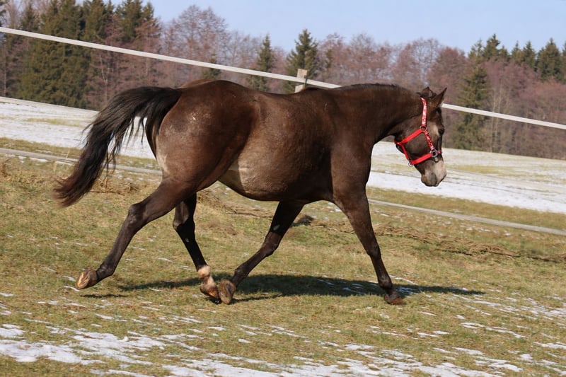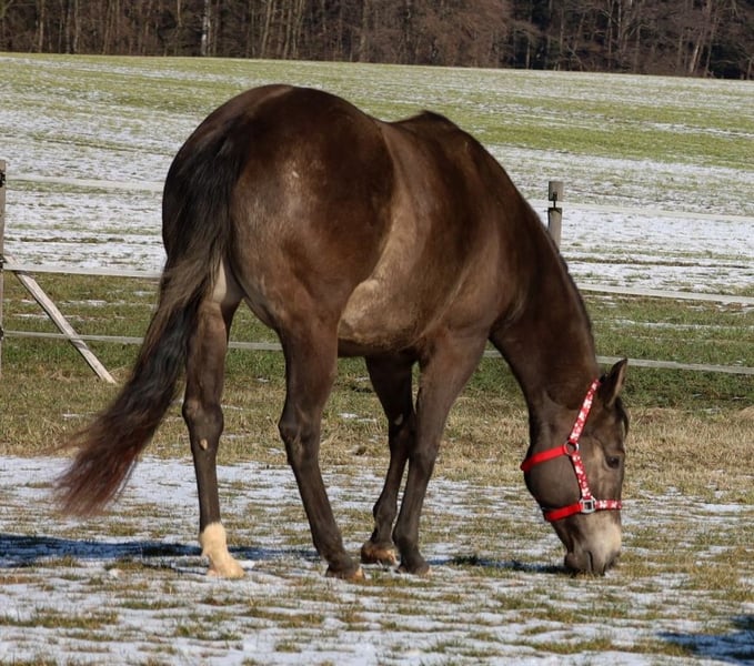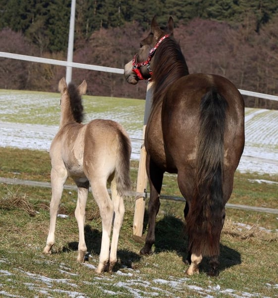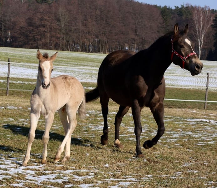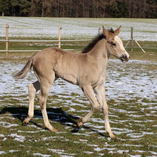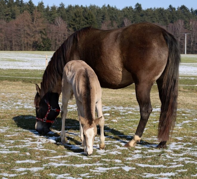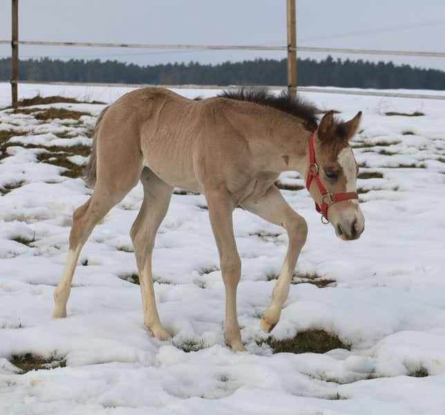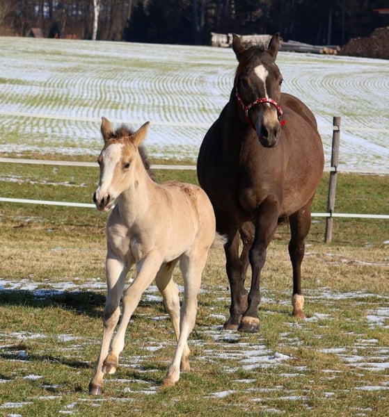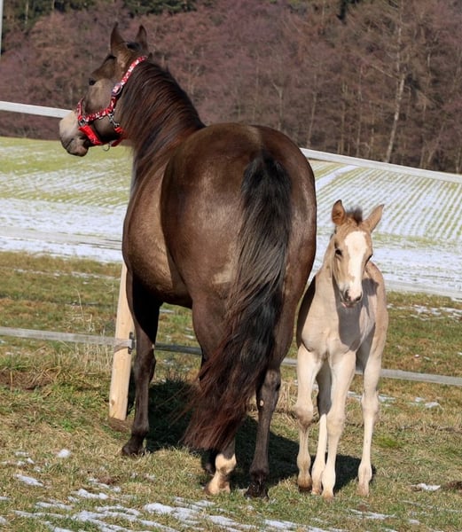 GOTTA LOPIN LUCINDA, urodzona 26.01.2026, buckskin Na tym naszym pastwisku „Liz Gotta Gun“ (Lisbeth) i „Blackberry“ stworzyli naprawdę słodką klaczkę urodzoną z miłości – można tylko powiedzieć, że ta krycia była idealna. „Lucinda” odziedziczyła po rodzicach wszystkie pozytywne cechy: poprawną budowę ciała i ustawienie kończyn, dużo uroku i charakteru, potencjał ruchowy, a z pewnością będzie niezawodnym partnerem do jazdy, tak jak jej rodzice, co z pewnością sprawi, że miłośnicza jazdy rodzina będzie z niej bardzo zadowolona. Będzie także doskonałym koniem do jazdy w reiningu i klasach ranch horse, takich jak Ranch Riding, Ranch Trail, Ranch Rail, a także w sportach wszechstronnych. O tym świadczy także jej rodowód, w którym znajduje się wiele wysokiej klasy reproduktorów i legend hodowli Quarter Horse, takich jak Hollywood Dun It, Grays Starlight, Smart Little Lena, Continental King i King P-234. Dokumenty AQHA są dostępne online, a wkrótce zostanie ona oznakowana chipem i otrzyma paszport DQHA wraz z zaświadczeniem hodowlanym. Oboje rodzice przeszli test 5-panelowy oraz test IMM/MYH1. Jak wszystkie nasze źrebięta, dorasta w stadzie z rówieśnikami i innymi końmi, pod opieką doświadczonych wychowawców. Regularne odrobaczanie i wizyty u kowala są u nas standardem. Przy sprzedaży zapewniamy ubezpieczenie na życie wraz z zaświadczeniem lekarskim o stanie zdrowia. Koszty i ryzyko pozostają u nas do momentu przekazania – czyli do końca 6. miesiąca życia. Na życzenie i na koszt kupującego możliwa jest wpłata na program Futurity NRHA i NSBA (od tego roku dostępne) oraz program młodych koni EWU. Jej rodzice i kilka półbraci są dostępni do obejrzenia na naszej farmie. Na ostatnich zdjęciach widać jej rodziców. Tel. 0170/4443194 Więcej zdjęć i informacji na stronie www.goetz-quarterhorse.de