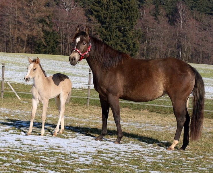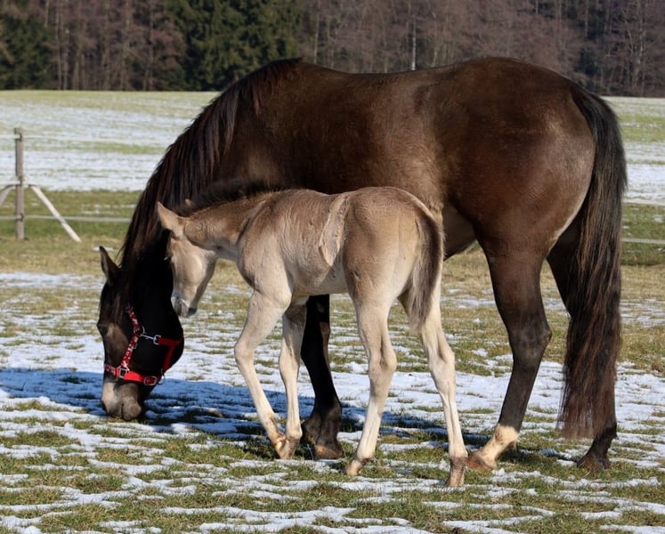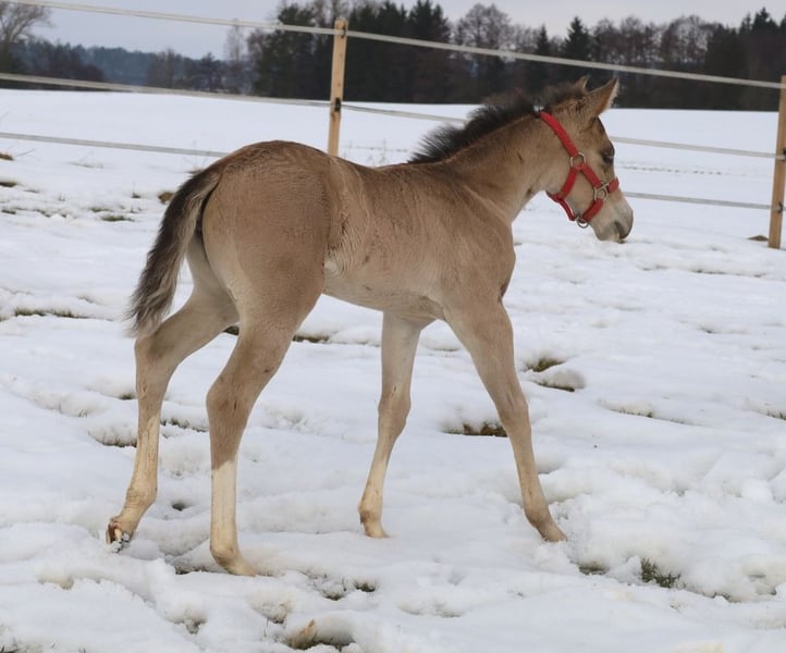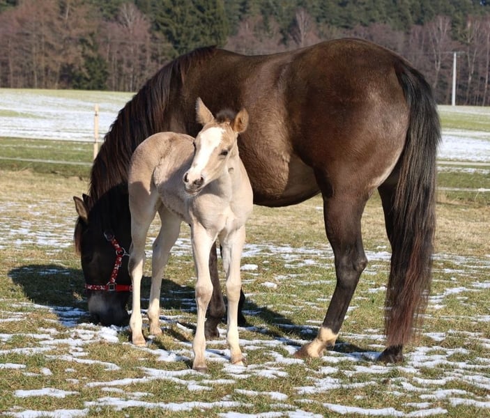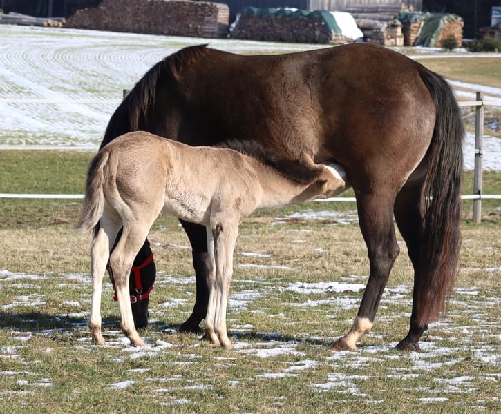 GOTTA LOPIN LUCINDA, born January 26, 2026, Buckskin Our "Liz Gotta Gun" (Lisbeth) and our "Blackberry" have created an incredibly sweet filly – a pairing that simply couldn’t be more fitting. Lucinda has inherited all the positive traits from her parents: correct conformation and movement, lots of charm and presence, and great potential in movement. She is sure to become a reliable riding partner, just like her parents, making her an excellent choice for a horse-loving family to enjoy. She will also be a good riding horse for Reining and Ranch Horse classes, such as Ranch Riding, Ranch Trail, Ranch Rail, and can also excel as an all-rounder. Her pedigree supports this, featuring many high-quality sires and legendary names in Quarter Horse breeding, such as Hollywood Dun It, Grays Starlight, Smart Little Lena, Continental King, and King P-234. Her AQHA papers are available online and will be sent to us shortly. She will be microchipped soon, and the DQHA equine passport including breeding certificate will be applied for. Both parents have undergone 5-panel testing and IMM/MYH1 testing. Like all our foals, she is raised with peers and other horses in a herd and is handled by knowledgeable caretakers. Regular deworming and hoof care appointments are standard practice here. In case of sale, she will be insured for life, including a veterinary health certificate. Costs and risks remain with us until she is handed over, which will be after she completes her sixth month. Upon request and at the buyer’s expense, she can be entered into the NRHA Futurity and NSBA programs (possible from this year), as well as the EWU Young Horse Program. Her parents and several half-siblings can be visited at our farm. The last photos show her parents. Phone: 0170/4443194 Many pictures and more information are available at www.goetz-quarterhorse.de