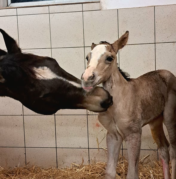 GOTTA LOPIN LUCINDA, born January 26, 2026, Buckskin Our "Liz Gotta Gun" (Lisbeth) and our "Blackberry" have created an incredibly sweet filly – a pairing that simply couldn’t be more fitting. Lucinda has inherited all the positive traits from her parents: correct conformation and movement, lots of charm and presence, and great potential in movement. She is sure to become a reliable riding partner, just like her parents, making her an excellent choice for a horse-loving family to enjoy. She will also be a good riding horse for Reining and Ranch Horse classes, such as Ranch Riding, Ranch Trail, Ranch Rail, and can also excel as an all-rounder. Her pedigree supports this, featuring many high-quality sires and legendary names in Quarter Horse breeding, such as Hollywood Dun It, Grays Starlight, Smart Little Lena, Continental King, and King P-234. Her AQHA papers are available online and will be sent to us shortly. She will be microchipped soon, and the DQHA equine passport including breeding certificate will be applied for. Both parents have undergone 5-panel testing and IMM/MYH1 testing. Like all our foals, she is raised with peers and other horses in a herd and is handled by knowledgeable caretakers. Regular deworming and hoof care appointments are standard practice here. In case of sale, she will be insured for life, including a veterinary health certificate. Costs and risks remain with us until she is handed over, which will be after she completes her sixth month. Upon request and at the buyer’s expense, she can be entered into the NRHA Futurity and NSBA programs (possible from this year), as well as the EWU Young Horse Program. Her parents and several half-siblings can be visited at our farm. The last photos show her parents. Phone: 0170/4443194 Many pictures and more information are available at www.goetz-quarterhorse.de