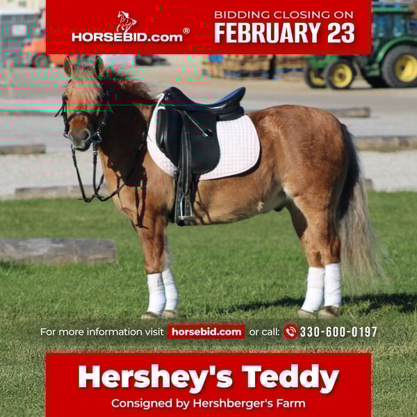 💎 𝐓𝐇𝐄 𝓓𝓲𝓪𝓶𝓸𝓷𝓭 𝐒𝐇𝐎𝐖𝐂𝐀𝐒𝐄 💎 Happening now thru MONDAY | FEBRUARY 23rd - Available EXCLUSIVELY on HorseBid's website! For more details and to register visit: www.Horsebid.com CONSIGNOR CONTACT: Hershberger's Farm 330-600-0197 LOCATION: Millersburg, OH BREED: Quarter Horse X Pony REGISTERED: No REGISTERED NAME: Hershey's Teddy COLOR: Buckskin HEIGHT: 13 AGE: 10 GENDER: Gelding WOW WHAT A SWEET LITTLE PONY!! Teddy has been here with the Hershberger family for the past 5 years! He has been on countless trail rides and always took great care of his rider. Teddy is that perfect size where an adult can ride him but not too big for small kids. Teddy has done a lot of pony rides here on the farm and is always happy to greet the kids with a smile. He loves the treats he gets from the visiters in the petting area. Teddy is very safe for beginners and will always look out for his rider. He has been ridden English, Western , or Bareback. As well as riding Teddy also doesn't mind pulling a cart. He has been driven single or double with another pony. If a more experienced rider gets on him Teddy can also be a lot of fun. He picks up both leads cantering in a circle and has a very nice lope for a pony his size. Teddy has also done some small jumps and loves it!! On trail rides Teddy loves to go through water and he'll also step over logs. He is very safe in traffic and doesn't mind the big trucks at all. Teddy is always the first one to come running up to the gate when you call him in from the pasture. Teddy loves to get a bath and also stands nice for the fairrer. Here is a sweet little pony that checks all the boxes! He is truly a ONCE IN A LIFETIME FIND!!! If you are looking for a companion for your kids or grandkids and safety is a concern you just can't afford not to have Teddy!!! If you would like to learn more about Hershey's Teddy Please call or text John @ 330-600-0197!