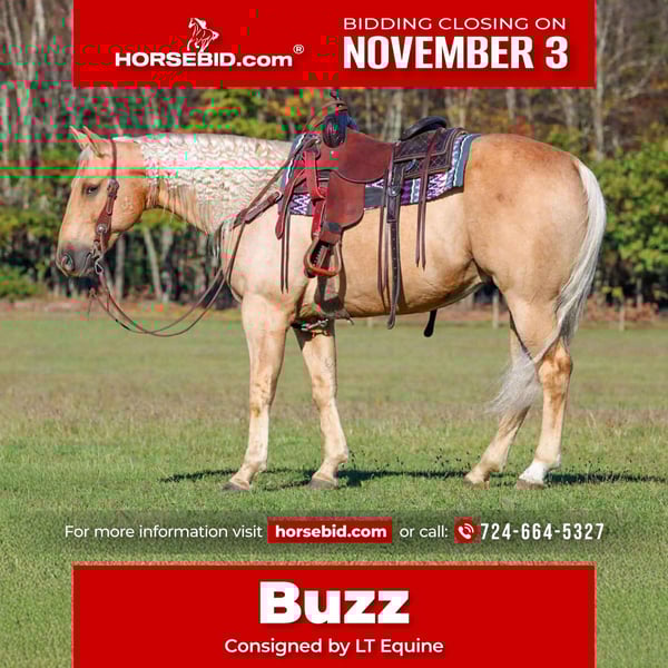⚜️𝐓𝐇𝐄 𝐅𝐀𝐋𝐋 𝐇𝐄𝐑𝐈𝐓𝐀𝐆𝐄 𝐂𝐋𝐀𝐒𝐒𝐈𝐂⚜️ Happening now thru MONDAY | NOVEMBER 3rd - Available EXCLUSIVELY on HorseBid's website! For more details and to register visit: www.Horsebid.com CONSIGNOR CONTACT: LT Equine 724-664-5327 LOCATION: Miola, PA BREED: AQHA REGISTERED: Yes REGISTERED NAME: Keg of Bugs COLOR: Palomino HEIGHT: 15 AGE: 9 GENDER: Gelding Introducing Keg of Bugs or as we like to call him Buzz! Buzz is a 15 hand tall beautifully built Palomino Gelding, with a long beautiful mane and tail! Buzz is a registered 9 year old AQHA who’s bloodlines carry back to the famous “Easy Six” and “Bugs Alive in 75”, Buzz is not only colored right, he’s bred right and broke the best! Buzz has been used for everything from ponying race horses on the track, ranched on in Oklahoma to rope cows and push cattle, he’s been used as a pick up horse in the local rodeos and trail ridden through the US. Buzz has a super fancy handle with an easy one finger neck rein, moves smooth and easily off leg pressure, and has a nice 360 turn around. He’s the kind of horse that will make any rider look fancy. And not to mention put a smile on your face because he’s so much fun! Buzz has an easy to que side pass, will open gates with ease. He has a nice relaxed walk and a slow trot with a head set and a nice ranch long trot. He picks up both leads and has great transitions. On the trail Buzz will go out alone or in a group. Does great over rough terrain. Will have a nice ranch walk or if you want a relaxed slow walk he’ll do that too. He’s not a spooky horse and has never offered to buck or bolt or rear. If you’re looking for a horse to take to sorting, ropings, playdays, barrels, poles, or ranch classes all the way to just pleasure trail riding he’s your guy! He’s athletic and loves to work! Buzz has great ground manners as well he stands well tied. Baths, good for farrier and vet. Loads and hauls quietly. Buzz is also microchipped and up to date on Coggins and deworming. Check out Buzz’s video and if you have any questions reach out to me! Thank you and have a wonderful day!