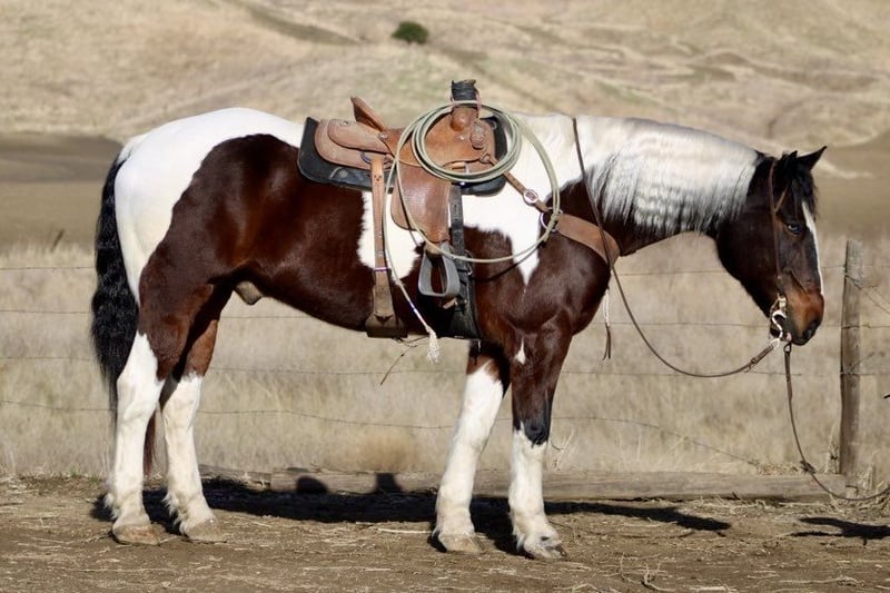 ONLINE AUCTION Place your bids at www.PlatinumEquineAuction.com Starting Bid $3500 Auction ends December 29th, 2024 Need a new saddle? Check out White Rock Saddles on our website or Facebook! Meet Bison… The gentle giant who will make your New Year unforgettable! This stunning 8-year-old tri color paint draft cross gelding is stunning with one blue eye standing at 16 hands, embodying strength and grace all wrapped up in one big puppy dog of a horse. Bison will greet you at the gate and put his nose in the halter he loves attention. Whether you’re gathering cattle or dragging calves to the fire or just enjoying a leisurely ride through picturesque state parks, he will calmly go out alone or with a groups of friends. He is great in the pasture with mares and geldings and is just as content in a stall setting. Bison is your go-to partner for any adventure. He calmly crosses flowing rivers and gracefully walks over downed trees while taking in the sights of wildlife with an air of confidence. With his impressive neck rein and sliding stop, this boy knows how to pick up leads like a pro in the arena making him perfect for riders from beginners to advanced he is a confidence builder. He’s also quite the star when it comes to parades, strutting his stuff like he owns the spotlight! But don’t let his good looks fool you; Bison has mastered obstacles too navigating bridges, car washes, and even tires with ease while looking effortlessly stylish whether dressed in English or Western tack. He has carried flags and is not bothered by tarps or balls he is just and easy going boy. He rides bareback in just a halter. You can stand on him slide off his butt and crawl all over him! Riding him feels like sinking into a plush couch; he’s as comfortable as they come! Plus, he’s easy to clip, show off at events or haul around town. He is not concerned about cars, semis or pedestrians. Bison tacks up easy stands for mounting and enjoys grooming sessions he is shod all the way around and good for the farrier. If you’ve been searching for that special equine companion who embodies both heart and versatility. Bison is waiting to meet you at Longhorn Ranch! Located in Paicines, CA contact Dina 831-537-1915. ONLINE AUCTION Place your bids at www.PlatinumEquineAuction.com Starting Bid $3500 Auction ends December 29th, 2024 Need a new saddle? Check out White Rock Saddles on our website or Facebook!
