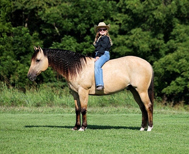 Colonel Doc Patron is consigned to the Best Of The West Horse Sale in Gladstone, NJ and will sell on September 27-28th. If you could put every ingredient that you wanted in a horse, into a blender and turn it on… when it got done I believe you’d have Doc! Doc is a 14.2H, 2016 Reg AQHA, gelding and check out that beautiful buckskin coat, his long wavy mane and the sweetest personality that you could ask for! Move on to the way he rides, loping nice circles, spinning around, slide stopping… he has the moves to go along with the good looks! Experience? Oh he has that too! From ranching to roping to trail riding he does it all and does it all right! Doc is great on the heel side, he is a good team sorting horse and he is more reliable than a 4×4 on the trails! Steep slopes, rocky terrain, creeks, logs, ditches… he crosses it all with ease! Doc is a laid back type of horse that is never in a hurry and is a horse that the whole family will enjoy and love for years to come! Feel free to call Eric 606-308-2461 with any questions! For more info go to www.AdamsHorseAndMuleCo.com