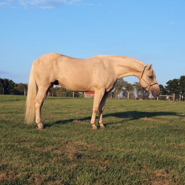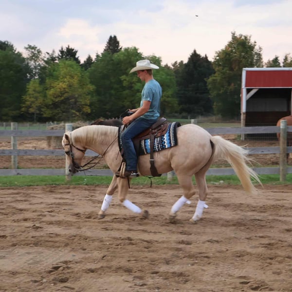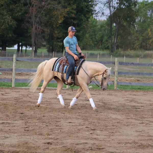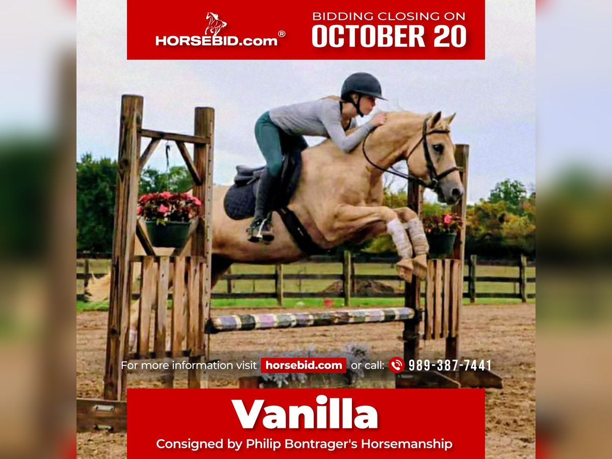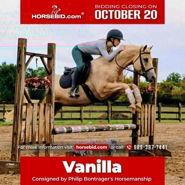 ♦️ 𝐭𝐡𝐞 𝐀𝐌𝐄𝐑𝐈𝐂𝐀𝐍 𝓕𝓪𝓵𝓵 𝓒𝓵𝓪𝓼𝓼𝓲𝓬 ♦️ Happening now thru MONDAY | OCTOBER 20th - Available EXCLUSIVELY on HorseBid's website! For more details and to register visit: www.Horsebid.com CONSIGNOR CONTACT: Philip Bontrager's Horsemanship 989-387-7441 LOCATION: Howell, MI BREED: Quarter horse REGISTERED: No REGISTERED NAME: Vanilla COLOR: Palomino HEIGHT: 14.2 AGE: 10 GENDER: Gelding Meet vanilla! Vanilla is a 10-year-old grade Quarter horse gelding. Vanilla is stunning with his palomino color and cute face. He stands 14.2hh and weighs around 1050 Ibs. He is very friendly and loves attention. Vanilla is a very laid back, and quiet horse with a very calm demeanor. He rides english and western, in the arena and or outside. Vanilla enjoys going on a trail ride, he rides out by himself and with other riders. Vanilla is a very good trail horse, he will gladly take the lead if you ask him and he is also happy to follow other riders. I have ridden Vanilla on the highways, in busy traffic, he enjoys the ride and is not bothered by traffic. He loads, clips, and baths. Vanilla has three very smooth gaits , walk, trot, and canter. He lopes nice circles, takes both leads, and he has a nice turn around. He is soft in the bridle and responds to leg cues. I have used Vanilla to do many different chores on the ranch from roping and ponying colts to practicing the roping dummy. Vanilla enjoys english riding and he is very talented. Vanilla has a beautiful flat kneed trot and a balanced canter. He has been started over fences and jumps a 10 every time. He keeps a steady pace up to the jumps and is very easy to see distance on. With just a little more training he could be a fantastic hunter. If you're looking for a beautiful gelding that turns heads with his looks, whether you want to do some fancy maneuvers, trail ride, or an all around horse that your kids can enjoy then Vanilla is for you. He will always stand out in any crowd. For more information or to schedule a visit please call Phil @ 989 387 7441.