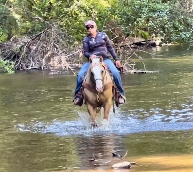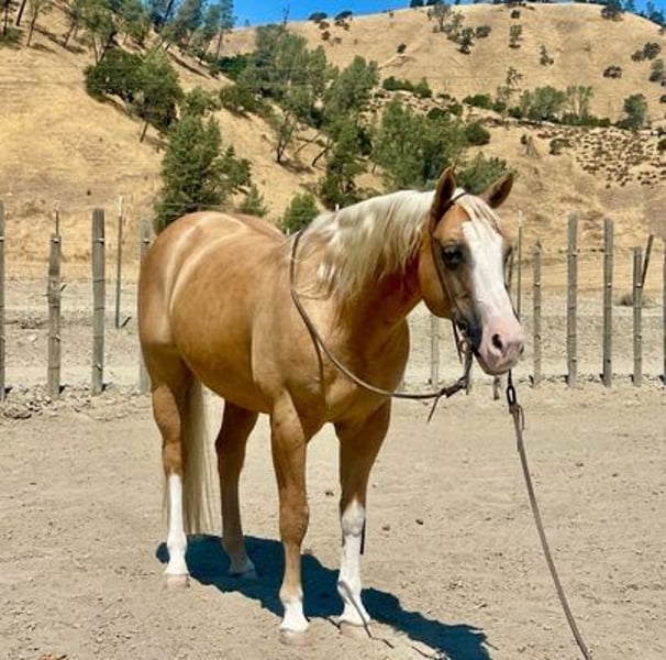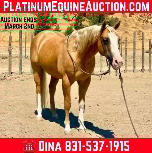 ONLINE AUCTION Place your bids at www.PlatinumEquineAuction.com Starting Bid $3500 Auction ends March 2nd, 2025 Need a new saddle? Check out White Rock Saddles on our website or Facebook! Meet Cruzn My Nu Hotrod, the palomino gelding that’s turning heads at our ranch! This guy is not just any horse; he’s a dual-registered superstar with APHA and AQHA, born in 2015 and standing at a solid 14.3 hands. Hotrod has that perfect look and build that every horse lover dreams of. Sired by The Great White Hope, who boasts lineage to the NRHA two-million-dollar sire Nu Chex To Cash, and with the legendary Zipps Chocolate Chip in his pedigree, he’s got some serious credentials! Hotrod was trained by a reining expert, and trust me, he knows how to move with style. From ranch riding to trail classes, he’s done it all and does it with flair. His resume is impressive—think classy spins, stunning sliding stops, and smooth circles. No quirks here; he’s the barn favorite for a reason! Plus, his ground manners are top-notch—clipping, brushing, shoeing, saddling, and bathing are all a breeze with him. Throw any obstacle his way, and he’ll tackle it with grace, whether it’s teetering bridges or trotting over poles. This guy is not just a pretty face; he’s also a fantastic ranch worker, eager to gather cattle and tackle any task you throw at him. Hotrod is great on trails, handling logs and rocky paths like a pro. He’s even started heeling and shows promise as a rope horse. With experience in busy parks and on beaches, he’s unfazed by trains, tourists, or joggers. Perfect for families and novice riders, he’s the definition of safe and reliable. Hotrod is always ready to greet you at the gate, making him the go-to horse for everyone. If you’re looking for a top-notch ranch horse or a classy show contender, give us a shout at Longhorn Ranch! Dina at 831-537-1915, located in beautiful Paicines, CA, would love to introduce you to this phenomenal gelding! ONLINE AUCTION Place your bids at www.PlatinumEquineAuction.com Starting Bid $3500 Auction ends March 2nd, 2025 Need a new saddle? Check out White Rock Saddles on our website or Facebook!