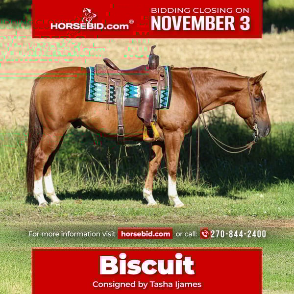 ⚜️𝐓𝐇𝐄 𝐅𝐀𝐋𝐋 𝐇𝐄𝐑𝐈𝐓𝐀𝐆𝐄 𝐂𝐋𝐀𝐒𝐒𝐈𝐂⚜️ Happening now thru MONDAY | NOVEMBER 3rd - Available EXCLUSIVELY on HorseBid's website! For more details and to register visit: www.Horsebid.com CONSIGNOR CONTACT: Tasha Ijames 270-844-2400 LOCATION: Henderson, KY BREED: Quarter Horse REGISTERED: No REGISTERED NAME: Biscuit COLOR: Sorrel HEIGHT: 14.3 AGE: 10 GENDER: Gelding Biscuit is a 10yr old sorrel dripping in chrome standing about 14.3hands tall and stout. He has been trail ridden extensively by a gentleman for the past 6 years. Biscuit has been on overnight trail rides, packed saddle bags, and tied to the picket line overnight. He’s been to the chuck wagon races every year in Clinton AR for a week the past 6 years. He takes in all the hustle, noise, and excitement with no problems. Biscuit will trail ride alone, in small groups, as well as large groups. He is use to traffic, ATV’s, heavy machinery and dogs. You can ride down the road, ride the farm or go hit the trails. He will travel the trails with ease, go through the creeks, over bridges and up and down the big cliffs. Biscuit will neck rein, W/T/C, stops when asked and backs up. He is no stranger to a long days work as he has pushed cattle on the farm gathering them and penning them off. He has been to the stockyards sorting and loading cattle. On the ground Biscuit has great ground manners and will be patient and respectful everyday. He stands tied quietly, stands for farrier, to groom, tack up and baths. He jumps right in the trailer and unloads easily. He will stand at a mounting block for you to get on and off and doesn’t move until asked. We invite you to come check Biscuit at our barn in Henderson, Kentucky. We are happy to assist with transportation arrangements. PPE at buyers expense. For any questions about Biscuit please call or text Tasha 270-844-2400