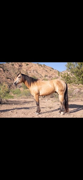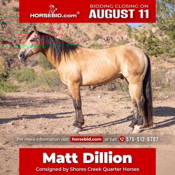 ⚜ The HERITAGE Classic ⚜ Happening now thru MONDAY | AUGUST 11th - Available EXCLUSIVELY on HorseBid's website! For more details and to register visit: www.Horsebid.com CONSIGNOR CONTACT: Shores Creek Quarter Horses 575-512-6707 LOCATION: Cliff, NM BREED: Quarter horse REGISTERED: Yes REGISTERED NAME: Watch Dualin cat COLOR: Buckskin HEIGHT: 15.1 AGE: 11 GENDER: Gelding Matt Dillon is an 11 year old gentle gelding who has been used for all aspects of ranch work. He has doctored a lot of yearlings out side and drug a lot of calves, good in rough country and on the trails. Good feet and bone with a tail that drags the ground. He stays gentle with no hump or buck but still has enough action to get the job done. Good to shoe. Don’t miss out on this one!