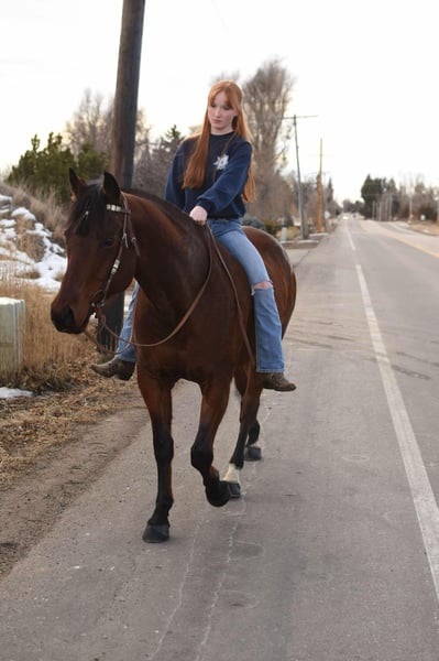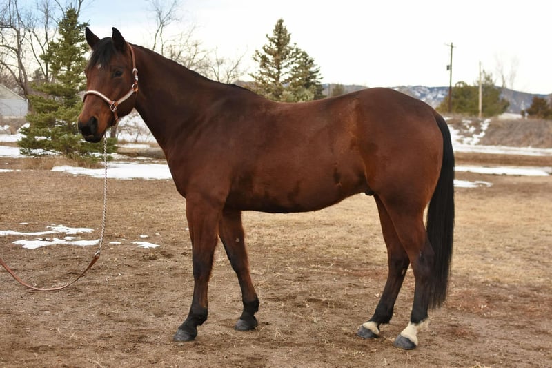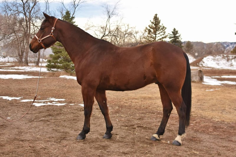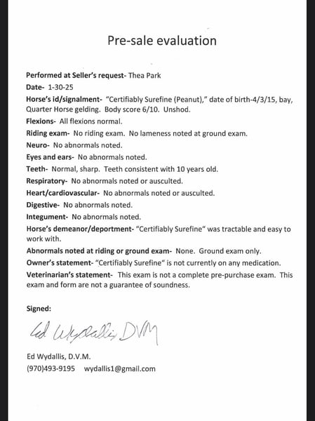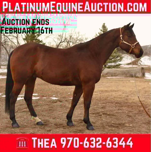 ONLINE AUCTION Place your bids at www.PlatinumEquineAuction.com Starting Bid $3500 Auction ends February 16th, 2025 Need a new saddle? Check out White Rock Saddles on our website or Facebook! “Certifiably Surefine” (AKA Peanut) is one of the nicest bred geldings on top of an incredible personality and work ethic that we have had! “Peanut” is 10 years old, 15.2 hands and built like an absolute tank! Peanut has all the bells and whistles, from western pleasure to cross country/hunter jumper to cruising the trails in town and up in the mountains this horse has tons of experience and miles. Peanut has a gorgeous western pleasure jog and lope, simple and flying lead changes, pivot, side pass and has a great frame and collection. He knows voice commands and will work off your legs, he is incredibly light off of your hands and legs and is easy and simple to ride. I have had ages as young as 10 on him messing around on him bareback in just a halter and he puts up with all of the shenanigans! We have taken peanut downtown, to the coffee shop, right along the highway or through downtown Fort Collins without issue! He’s used to dogs, strollers, runners, trains, vehicles and any other chaos you’ll find on our busy trails. We have also taken peanut to the mountains and done harder rides with steeper terrain that he has handled like a pro as well, He’s seen all kinds of animals and wildlife! On top of all of his arena and trail prowess he has been started English and over fences and is absolutely loving it, he knows an English collection and will cruise through a course without refusing or hitting a jump. We have also trailered him to a cross country course which he absolutely loved and definitely has a future in. Peanut has jumped up to 2’6 with room to improve. This is an all around good boy with a goofy personality and a sweet demeanor. He is first to meet you at the gate, loves all other horses and is easy to do just about anything with from loading, unloading, bathing- good for the vet and farrier and is good for deworming! Come meet this sweet guy. Located in Fort Collins, CO. Contact Dynamite Horses Thea 970-632-6344 with any questions. ONLINE AUCTION Place your bids at www.PlatinumEquineAuction.com Starting Bid $3500 Auction ends February 16th, 2025 Need a new saddle? Check out White Rock Saddles on our website or Facebook!