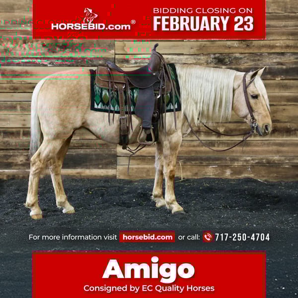 💎 𝐓𝐇𝐄 𝓓𝓲𝓪𝓶𝓸𝓷𝓭 𝐒𝐇𝐎𝐖𝐂𝐀𝐒𝐄 💎 Happening now thru MONDAY | FEBRUARY 23rd - Available EXCLUSIVELY on HorseBid's website! For more details and to register visit: www.Horsebid.com CONSIGNOR CONTACT: EC Quality Horses 717-250-4704 LOCATION: Beaver Springs, PA BREED: Quarter Horse REGISTERED: No COLOR: Palomino HEIGHT: 14.1 AGE: 12 GENDER: Gelding Amigo is a 12yr old gorgeous Palomino Gelding. He stands approximately 14.1hh tall and built to perfection. Amigo is absolutely safe for just about anyone! He’s one that’s user friendly whether it be your friends, kids, or grandma he will take care of them! Amigo is the kind that excels in every discipline. He’s the kind you can go show english in the jumping or even the equitation. Amigo has all the ability to even go show in the 4h with the kiddos! Amigo is just as perfect out on the trails as he is the arena. We have trail ridden Amigo out in the woods, through all types of terrain. He’s always point and go with no hesitation. In the Arena Amigo will walk, trot, and canter. He’s super easy to ride. He has a one step lope. Amigo is comfortable and transitions nicely into each gait. He is soft in the bridle and you can even ride him bridless! Amigo has been there and done that. He’s seen just about anything and everything! He’s gentle and kind! He’s a gentleman to be around! Amigo is the kind that everyone wants in there barn! He is selling 100% Sound! A PPE is welcome at the buyers expense. He will come with a current coggins and health certificate after purchase! For further information regarding Amigo please don’t hesitate to reach out to Carley @ 717-250-4704