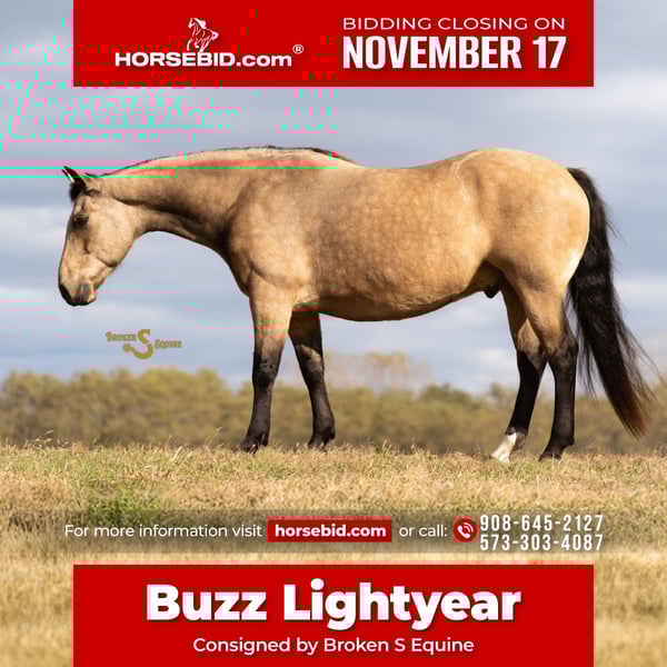 🎲𝓽𝓱𝓮 𝐑𝐈𝐃𝐄𝐑'𝐒 𝓒𝓱𝓸𝓲𝓬𝓮🎲 Happening now thru MONDAY | NOVEMBER 17th - Available EXCLUSIVELY on HorseBid's website! For more details and to register visit: www.Horsebid.com CONSIGNOR CONTACT: Broken S Equine Kieran 908-645-2127 or Beau 573-303-4087 LOCATION: Bogard, MO BREED: Quarter Horse REGISTERED: Yes REGISTERED NAME: Buzz Lightyear COLOR: Buckskin HEIGHT: 15 AGE: 11 GENDER: Gelding Buzz Lightyear is an 11 year old registered Quarter Horse gelding standing 15 hands high. He has a solid resume on the ranch, in the arena, and as a 4h horse. Buzz can do a bit of everything, all while keeping his rider safe and happy! He's the perfect age; he's done and seen it all, and has plenty of life experience. Buzz has seen a days work on the ranch, doctored cattle, given riding lessons, and always enjoys a day at the cross country course. Whether you want to get out and try new things, or you just want a reliable partner to learn and grow with, Buzz would love his own person to take on the world with! In the ring, Buzz is straightforward and simple. He has three comfortable and easy to sit gaits. He is a good mix of whoa and go; being steady, without being a dead head. If you ask him to go, he'll go. And if you ask him to slow it down, he's happy to poke along. Buzz will lope circles on a loose rein, or ride round in the bridle when asked. He picks up both leads easily, and is adjustable in all of his gaits. He is happy to trot around over cross rails or small logs with beginners, and has jumped around Novice fences and options with adults. On the trails, Buzz is a master. He crosses all obstacles, swims, is safe in traffic and in town, and will happily trail ride off anywhere you take him. Buzz is very used to loading up and going new places. He is a perfect gentleman on the trailer and is easy to load and travel with. He is used to livestock, dogs, atv's, bikes, and more. He's a been there, done that, type of guy on the trails! In the barn, Buzz is polite and respectful, with great ground manners. He is the type of horse that learns who his person is and really connects with them. He would love to have someone who enjoys not just riding, but bonding, with their horses. Buzz is an easy keeper who is happy living inside or out. He gets along well with his pasture mates and is overall just an easy guy to have around! ⚫️Buzz Lightyear is an easy keeper with no maintenance. We have a recent, clean vet check on file. ⚫️Our program aims to train and produce top quality horses and ponies for all disciplines and experience levels. Check out our website for testimonials! ⚫️We are located in Bogard, MO. We can help you arrange shipping anywhere! ⚫️For more information about Buzz Lightyear, or any of our other horses call or text us. Kieran 908-645-2127 Beau 573-303-4087