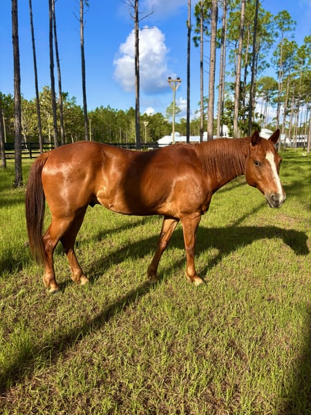 A Red Hot Summer Affair, barn name Harley, is a stunning chestnut 2014 Quarter Horse ready to turn heads and win hearts! Whether you’re looking for a dependable partner in the show ring, a competitive prospect, or a reliable trail companion, Harley has the looks and talent to do it all. He’ll thrive with a junior-amateur rider and occasional trainer tune-up rides or in a consistent lesson program. He has competed in local shows, from 2’0” cross rails to 2’9” verticals, along with jumping up to 3’0” at home. While he only has experience in the hunter ring, he has enough drive to earn ribbons in the jumpers when asked to. Harley has a loving personality and can be turned out with mares or geldings without any issues. He is sound, goes easily barefoot, and has excellent overall health. This is a difficult decision for us, but we’ve made the choice to find him a new home where he can reach his full potential with someone who can give him the attention he deserves. Contact us today to meet Harley and see if he’s the perfect fit for you! *Videos Available on Request*