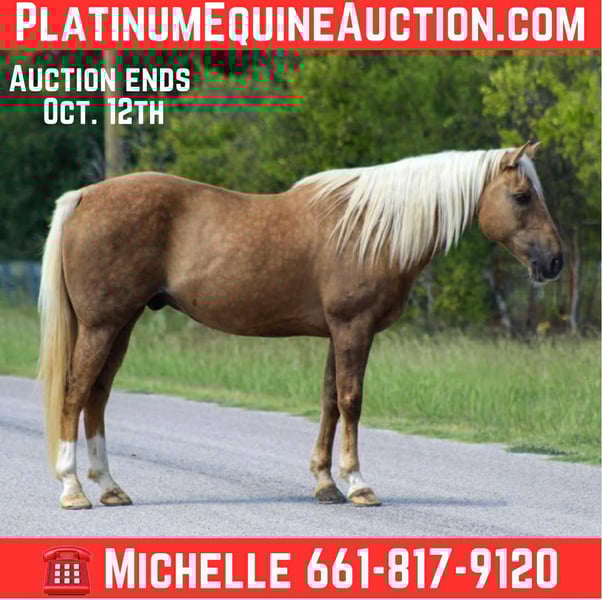 ONLINE AUCTION Place your bids at www.PlatinumEquineAuction.com Starting Bid $3500 Auction ends October 12th, 2025 Need a new saddle? Check out White Rock Saddles on our website or Facebook Meet First Down Firen, a stunning dapple palomino gelding who’s guaranteed to turn heads wherever he goes! Standing a solid 15 hands, this 2013 model, double-registered superstar combines beauty, brains, and versatility in one perfect package. He’s exceptionally well broke—soft and has a smooth walk, trot, and lope, with beautiful, correct circles. He’s one-handed broke, moves off your leg effortlessly, and counters arcs flawlessly. He will side pass to open and close gates. Whether you’re asking for finesse or workhorse reliability, he’s got it. On the ranch, he shines—gathering, sorting, and penning cattle with confidence. He’s spent long hours at the sale barn moving cattle and loading trucks. He’ll carry a flag proudly and would make a fantastic addition to any drill team. Fancy enough for the show pen? Absolutely. He’s got the looks, the skills, and the attitude to compete—and being double registered with both AQHA and PHBA just sweetens the deal. Trail riding? He’s your go-to guy. He confidently navigates steep, rocky terrain as easily as flat trails. Logs, bridges, water crossings? He’ll tackle them all without hesitation. Plus, he rides out calmly down busy highways with cars zooming by—no issues at all. He’s even been to the famous Fort Worth Stockyards and handled the excitement like a pro. Chewy is a true all-around horse that can do anything you want—ranch, trail, show, or play days .User-friendly and easy to enjoy, yet packed with those “extra buttons” to bring out his fancy side when you want. We are open to anyone interested in him to schedule a time to come see him or if you can’t make it schedule a FaceTime showing to see him. If you need help with transport don’t hesitate to ask we have a list of reputable haulers that can get him safely to your doorstep WORLD WIDE including, Alaska , Mexico, Hawaii, Canada and anywhere in between. Located in Stephenville, TX. Contact Michelle with M $ Performance Horses 661-817-9120 with any questions. ONLINE AUCTION Place your bids at www.PlatinumEquineAuction.com Starting Bid $3500 Auction ends October 12th, 2025 Need a new saddle? Check out White Rock Saddles on our website or Facebook