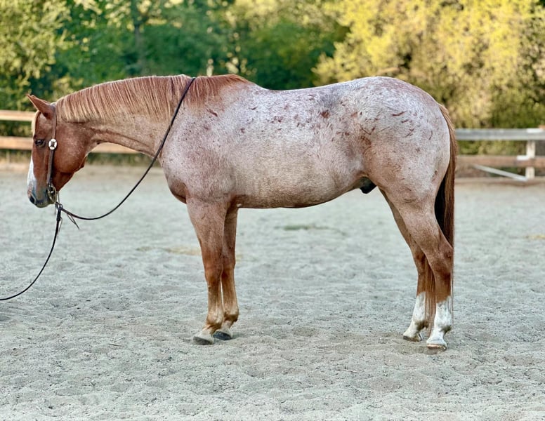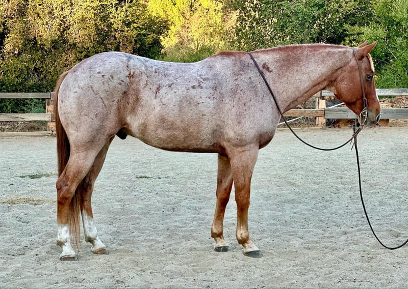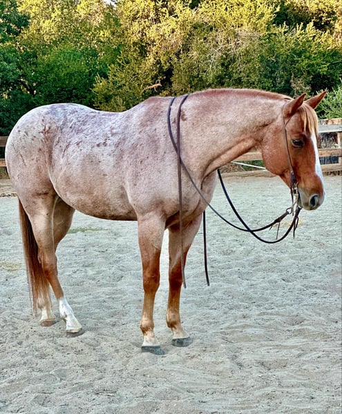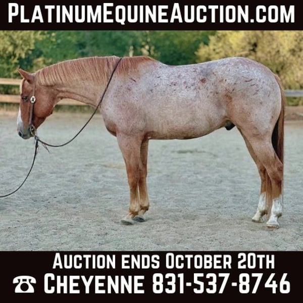 ONLINE AUCTION Place your bids at www.PlatinumEquineAuction.com Starting Bid $3500 Auction ends October 20th, 2024 Need a new saddle? Check out White Rock Saddles on our website or Facebook! Raisin is a grade 10 year old red roan gelding standing firmly at 15HH. if you’re looking for a family favorite, safe for everyone gelding with a super fun feel to him, Raisin is your guy! Raisin has been rode in downtown parades, all over the trails, beaches and country side. He is a true point and go type horse with zero refusal or bocks. He always has a good even pace and will keep up with the pack, or venture off alone. I cannot express how safe and reliable Raisin is. Throw a true beginner or a more advanced rider and they will both enjoy him just as much. As well as being safe, he is also super handy broke. Raisin was professionally started so he has a good one hand turn around, flying lead changes, and a nice stop, and my favorite button is his reverse, with only a tap your foot on his shoulder. He collects at the poll, is super soft in the bridle and responsive to leg cues. He truly is so much fun to ride whether it be out on trails or in the arena, he is fancy enough to be competitive in ranch versatility classes as well as competitive trail. Raisin loves his people and is easy to catch. Will stand tied quietly for tacking, bathing or clipping. He is great for the farrier and loads in any trailer. He is always a true gentlemen on the ground and will be respectful of the kids. He has carried flags, tarps, and isn’t afraid of anything. He has no spook, doesn’t get fresh with time off and is one you can be confident will always act the same no matter the situation. Raisin is a true gem and people search the entire US to find one with his color, looks, and demeanor! He is located in Bitterwater, CA. For more info or to make an appointment to come see him please contact Cheyenne Rey 831-537-8746. ONLINE AUCTION Place your bids at www.PlatinumEquineAuction.com Starting Bid $3500 Auction ends October 20th, 2024 Need a new saddle? Check out White Rock Saddles on our website or Facebook!