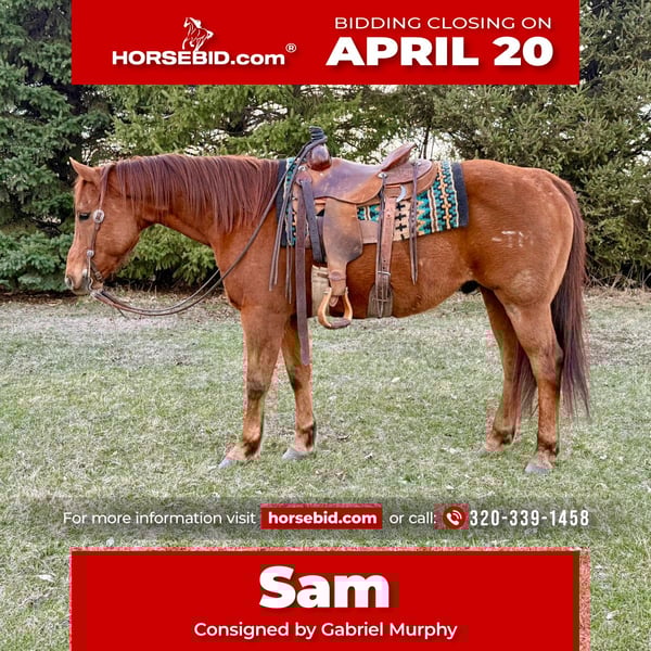 ⚜️𝐭𝐡𝐞 𝓔𝓵𝓲𝓽𝓮 𝐒𝐩𝐫𝐢𝐧𝐠 𝐂𝐥𝐚𝐬𝐬𝐢𝐜⚜️ Happening now thru MONDAY | APRIL 20th - Available EXCLUSIVELY on HorseBid's website! For more details and to register visit: www.Horsebid.com CONSIGNOR CONTACT: Gabriel Murphy 320-339-1458 LOCATION: Cannon Falls, MN BREED: Quarter horse REGISTERED: No REGISTERED NAME: Sam COLOR: Sorrel HEIGHT: 15 AGE: 12 GENDER: Gelding Sam Sam is a 12-year-old grade sorrel gelding standing a solid 15 hands tall with plenty of foot, bone, and a build made to last. He is the definition of a true trail and ranch horse deluxe—the kind of safe, dependable gelding that fits the whole family. If you’re looking for a trustworthy, confidence-building partner this summer, Sam is your guy. He has a slow, ground-covering walk that is comfortable for riders of all levels, a smooth trot, and a slow, easy lope. He neck reins well, stays soft in the face, and has a true, reliable “whoa” that gives riders confidence every time. Sam has been used in the feed yards to sort and pen cattle, but what really sets him apart is his quiet, gentle nature. He’s the same horse every single day—level-headed, patient, and never in a hurry. He’s very forgiving and takes care of his rider, making him a great choice for beginners, kids, or anyone wanting a safe, stress-free ride. On the ground, Sam is as kind and easy as they come. He’s easy to catch and will meet you at the gate, stands tied quietly, and is simple to saddle and bridle. He’s respectful, gentle, and enjoys attention—making him a great fit for a family setting. Out on the trail, Sam is as solid as they come. He’ll go anywhere you point him without hesitation—through water, over downfall, and across any terrain. He rides out alone or with others and stays calm and confident either way. We’ve also taken him into town around traffic and along busy roads, and he handles it all quietly and safely. One of Sam’s best qualities is his consistency. He can sit for weeks or even months, and when you go to ride, he’s the exact same horse—no surprises, no nonsense. Just saddle up and enjoy the ride. Sam is the kind of gelding that gives peace of mind. Whether you’re looking for a safe horse for your kids, a reliable mount for trail riding, or a gentle partner the whole family can enjoy, Sam is the one you can count on. Safe, broke, and dependable—Sam is the kind everyone is searching for.