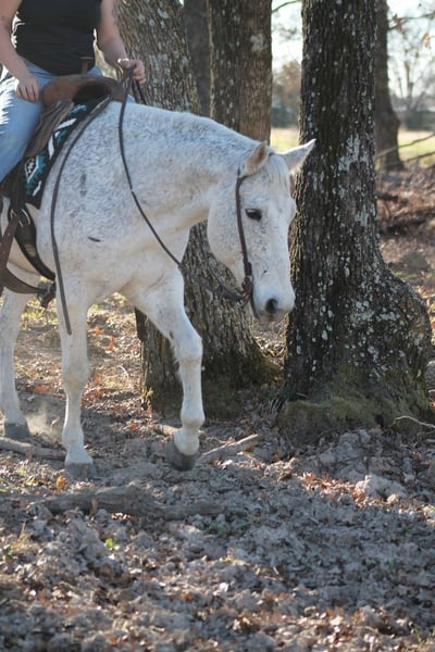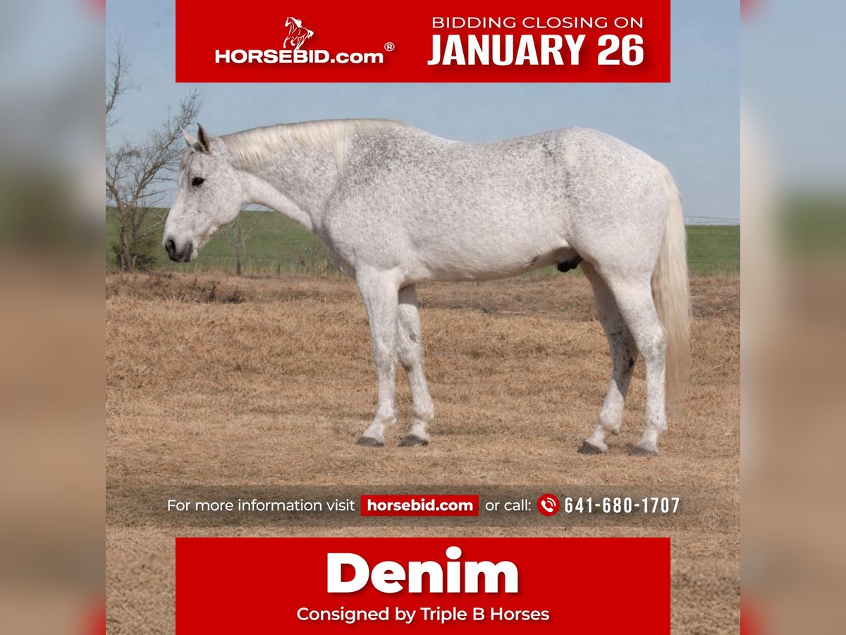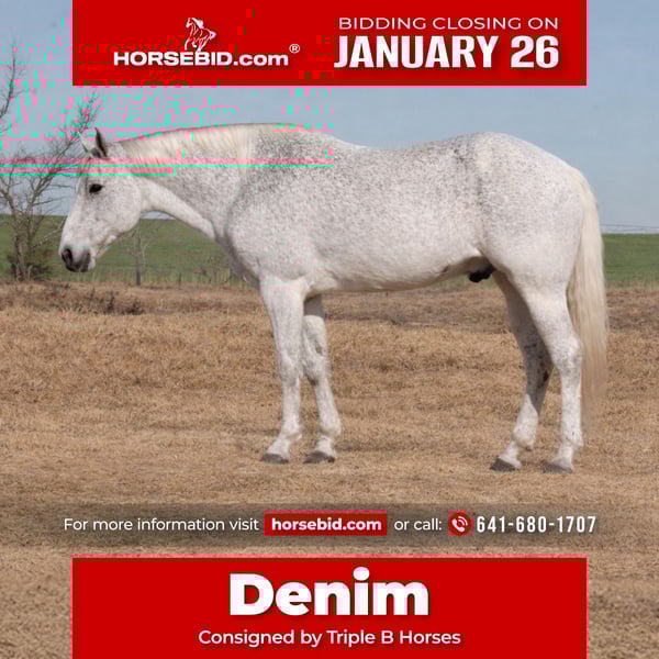 𝐉𝐀𝐍𝐔𝐀𝐑𝐘 ⭐️𝑨𝒍𝒍 𝑺𝒕𝒂𝒓 𝑳𝒊𝒏𝒆𝒖𝒑⭐️ Happening now thru MONDAY | JANUARY 26th - Available EXCLUSIVELY on HorseBid's website! For more details and to register visit: www.Horsebid.com CONSIGNOR CONTACT: Triple B Horses 641-680-1707 LOCATION: Plano, IA BREED: QH REGISTERED: No REGISTERED NAME: Denim- Ultimate family horse COLOR: Grey HEIGHT: 15 AGE: 12 GENDER: Gelding !THE ULTIMATE FAMILY HORSE! Denim is a 12 year old grade gelding standing 15 hands tall and full made. This gelding is a TOTAL sweetheart. He is safe, sane, sound, and a true confidence builder. In the arena, down the trails, through town Denim is as solid as they come and takes care of his rider every single time. Leave him sit for months on end he will walk up the gate with the same loving personality, saddle with no issues, and ride off without a single fuss. He is type of gelding that reminds you why you love horses so much. He is an easy keeper, a total baby sitter, and such a joy to be around. On the trails Denim will cross water, slow step down steep ditches, walk quietly over logs,and goes through mud without a bobble. He has been on family camping trips all over the US. Denim hauls quietly, stalls well, and adapts to any new environment with zero drama. He has ZERO spook. I swear we have thrown every crazy thing we could think of at this guy and he never batted an eye. This is the type of gelding that dosent become available everyday and we are very blessed to be able to represent him. He will teach your kids, friends, cousins, and heck maybe even the dog how to ride. In the arena Denim will walk, trot, and lope on a loose rein. He is easy to stop and backs well. A true one hand neck rein. Denim is very forgiving of inexperienced riders. An accidental yank, kick, pull- he stays level headed and carries on without a fuss. He is easy to catch, stands tied, loads well, good for the farrier and vet. He is a true beginner safe horse! The previous owners did rope the head side and won a few saddles and buckles. We are not ropers so I do not have videos of him doing so but if that is something up your alley he marks the box!