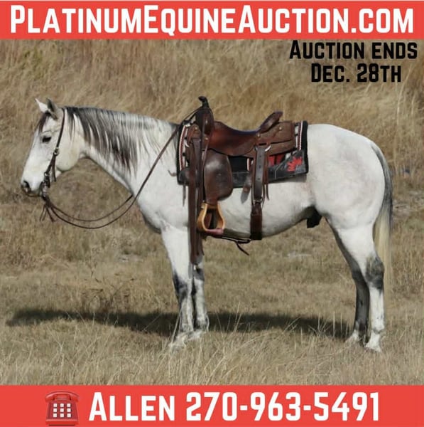 ONLINE AUCTION Place your bids at www.PlatinumEquineAuction.com Starting Bid $3500 Auction ends December 28th, 2025 Need a new saddle? Check out White Rock Saddles on our website or Facebook ✨ Braxton ✨ Not too many days left till Christmas, and everyone loves a WHITE Christmas!🎄🎁 Brax is an 11 year old grade, grey gelding, standing 15hh tall! He’s the kind of horse that makes you want to saddle up and go, whether it’s for a relaxing evening ride or a full day out on the trails. He’s confident, surefooted, and happy to lead or follow. He handles new country with ease, crosses obstacles willingly, and rides out alone or in a group. He’s the type you can trust to take care of you while still giving you that fun, forward ride that makes every trip enjoyable. Braxton is a well-rounded, versatile gelding with plenty of life in him. In the arena, he rides around soft and responsive. He’s been rode English as well and makes it super fun! If you’re looking for a good-minded, flashy gelding who’s safe, reliable, and fun, Braxton is the total package. He’s a true all-around partner with plenty of heart and the kind of looks that will turn heads wherever he goes. We are located in ♦️Mineral Wells Texas♦️but have reputable haulers that go all over the country, including Hawaii and Canada. Give me a call or text and I’d be happy to answer any questions! Contact Allen with AM Livestock 270-963-5491 ONLINE AUCTION Place your bids at www.PlatinumEquineAuction.com Starting Bid $3500 Auction ends December 28th, 2025 Need a new saddle? Check out White Rock Saddles on our website or Facebook