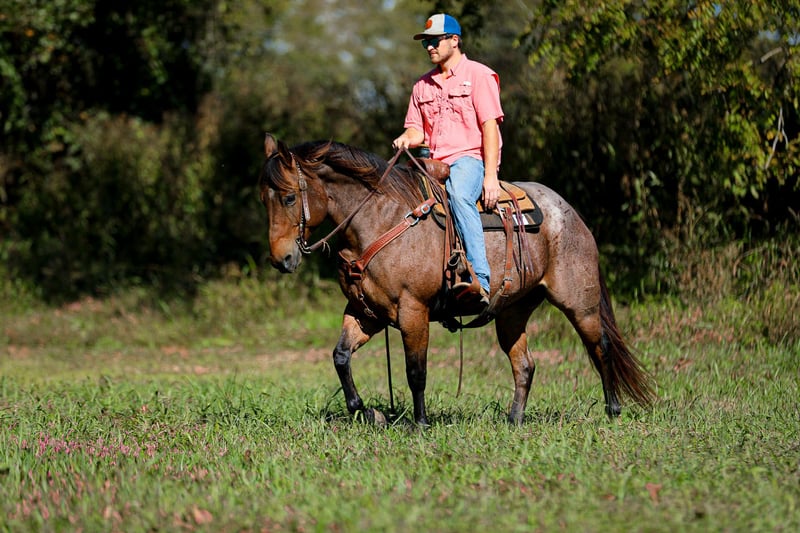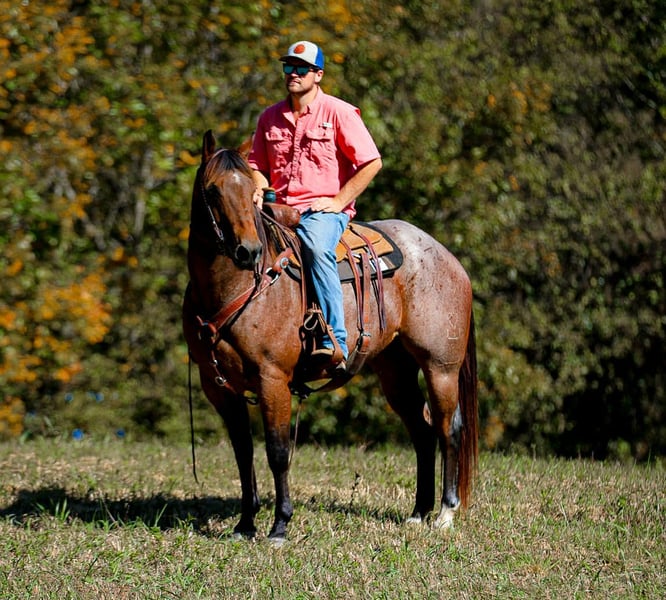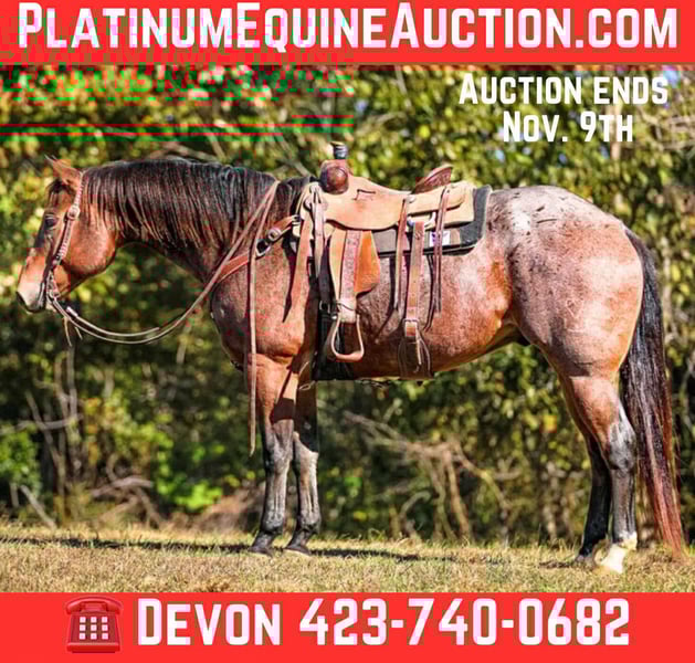 ONLINE AUCTION Place your bids at www.PlatinumEquineAuction.com Starting Bid $3500 Auction ends November 9th, 2025 Need a new saddle? Check out White Rock Saddles on our website or Facebook Meet Audi… a big, stout 11 yr old 15.2 hand bay roan gelding who checks all the boxes. If you’re looking for a safe, reliable gelding who’s stout enough to carry anyone all day long and handle a days work, Audi will be your man. He’s been used in and out of the arena and on the head side a ton. He’s also been trail rode extensively and is as sure footed as any. He will cross through water, over logs, and can handle busy traffic. He’s easy to catch in a stall or out in the pasture. He’s stands good to be saddled and enjoys a bath. Overall this is a nice gelding, that’s at the perfect age and will absolutely last. I feel most anyone can get along with Audi and will love him. Feel free to reach out for any more info. Located in Cookeville TN. Contact Devon Jones 423-740-0682. ONLINE AUCTION Place your bids at www.PlatinumEquineAuction.com Starting Bid $3500 Auction ends November 9th, 2025 Need a new saddle? Check out White Rock Saddles on our website or Facebook