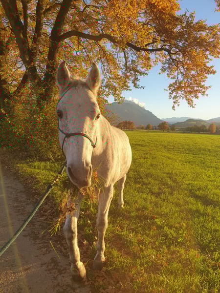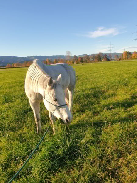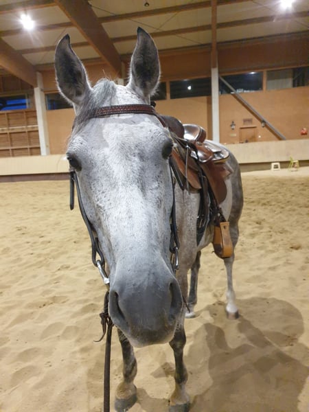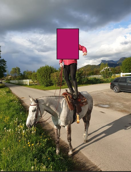 Wallach, geboren: 2014, Stockmaß: 155 cm, Schimmel, QuarterMix Charakter: sehr ruhig, unerschrocken und unglaublich verschmust, sehr, sehr menschenorientiert. Er liebt • die Bodenarbeit, Spaziergänge, Geländeritte Ausgezeichneter Ausbildungsstand, sehr vielseitig gearbeitet, Western geritten, kennt auch die englische Reitweise. Hat eine Grundausbildung in der Reining, hat Reiter schon zum WRC gebracht. Er wurde sehr vielseitig ausgebildet, uns war es immer wichtig, dass er viel kennt. Ebenfalls kennt auch den Trail sowie Gymnastiksprünge. Beherrscht beim Reiten unter anderem • Seitwärts, 2 er Galoppwechsel, Ansätze zur Piaffe Unter dem Sattel ist er auf dem Platz/ in der Reithalle ein gemütliches Pferd. Er wurde immer, egal ob bei Longenarbeit oder vor dem Reiten, gut aufgewärmt. Im Gelände ist er sehr, sehr gerne, er geht gerne hinaus und erlebt etwas. Keine Angst vor Kühen, Autos, LKW, Tieren, Wind, Sturm, Fahrrädern… ect. Bodenarbeit: Kennt Seitwärts von mir weg bzw. auf mich zu, Hinterhand weg/ zudrehen, freies longieren als großer bzw. kleiner Zirkel um einen herum, spanischer Schritt, ablegen auf Kommando… Gesundheit: PSSM Test negativ, hatte nie Kolik oder ähnliches; Kein Koppen, Weben etc. Er hat ein Schimmelmelanom am Hals. Schmiede und verladefromm, kennt sowohl Barhuf als auch Beschlag. Läuft ebenfalls brav in der Führanlage. Er steht in einer Paddockbox; kennt von uns nur 24 Stunden Heu- Fütterung. Er sucht ein neues Zuhause, in dem er freizeitlich gearbeitet wird. Bei Fragen einfach melden (via WhatsApp oder einfach Anrufen😊). Weiteres Kennenlernen gerne möglich:)