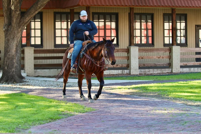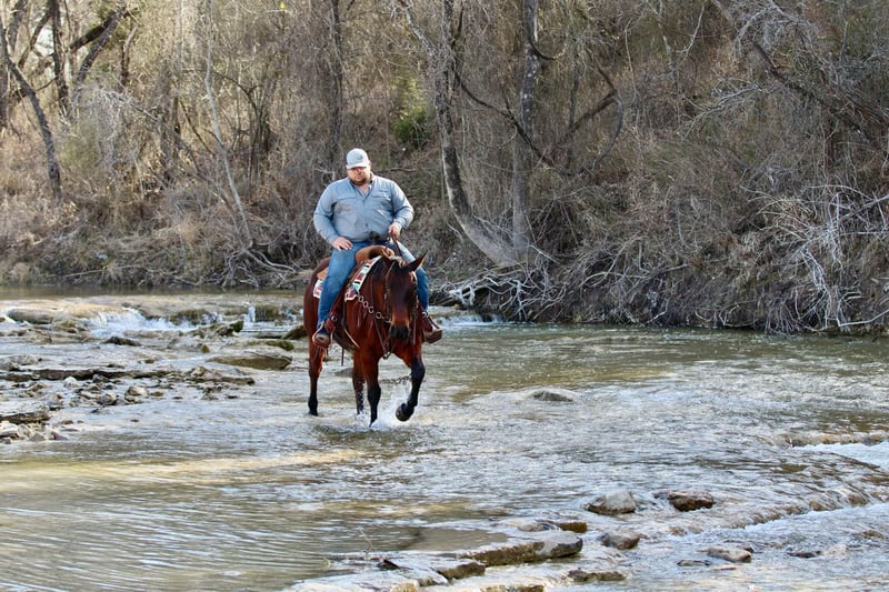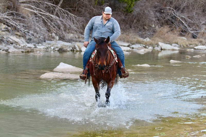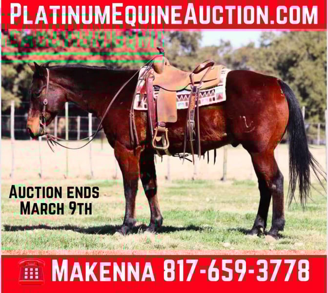 ONLINE AUCTION Place your bids at www.PlatinumEquineAuction.com Starting Bid $3500 Auction ends March 9th, 2025 Need a new saddle? Check out White Rock Saddles on our website or Facebook! Wow, is all we have to say about Badger! He is AQHA registered, RBR WARESTHECHICS, 2013 model bay gelding. You can never go wrong with a gelding like this, no matter what you are looking for, he is it! Badger is a jack of all trades! Down the trails, he is happiest, never bats an eye and goes absolutely anywhere you point him. He will cross through any body of water, go over anything you put him in front of, and never bats an eye at wildlife! Badge is very traffic and crowd safe, even handled the large crowd of people on a busy afternoon in downtown Fort Worth Stockyards like it was just another day! Badger has been used for multiple jobs, a turn back horse, he’s had steers headed and heeled on him, been used to doctor outside and knows what a long day of work at the sale barn is! He will cut a cow, and has been sorted on quite a bit. With all that being said, Badge is one hand broke, moves off your legs and rides the very best! He is beginner safe, great first time family horse, the once in a lifetime kinda horse. You can spend one second with this guy and know how special he is even if he’s wrapped in a plain bay wrapper! He is a puppy dog on the ground, picks up all four feet with ease, stands for the farrier and loves to be groomed. This is one of those horses you thought you’d never find, come see him for yourself! He is UTD on everything, and ready for his new family! Located in Lipan, TX. We can help arrange hauling anywhere in the US, Hawaii or Canada! Please call or text Makenna Hartzell 817-659-3778 for more information! ONLINE AUCTION Place your bids at www.PlatinumEquineAuction.com Starting Bid $3500 Auction ends March 9th, 2025 Need a new saddle? Check out White Rock Saddles on our website or Facebook!