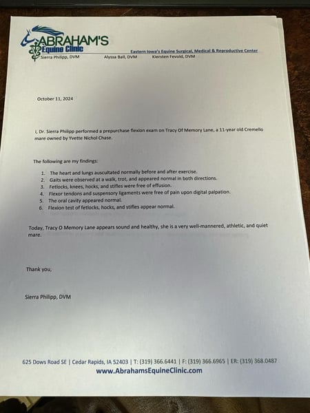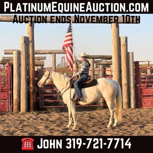 ONLINE AUCTION Place your bids at www.PlatinumEquineAuction.com Starting Bid $3500 Auction ends November 10th, 2024 Need a new saddle? Check out White Rock Saddles on our website or Facebook! Tracy Of Memory Lane is a 11-year-old registered AQHA Cremello mare that is suitable for the whole family she stands 15 hands tall and weighs approximately 1150 pounds. She has a lot of muscle and great confirmation she has a beautiful halter head with short ears. She has a deep heart girth and a big hip, all four straight legs and great hooves. Tracy‘s temperament is very docile and gentle. She is laid-back and sweet. Tracey loves attention. She has something for the whole family, she loves attention and is easy to catch. She is slow and confident for the little inexperienced ones and she is surefooted and very well broke for the experienced ones in the family. She has been shown in 4-H and has been ridden in parades during holidays. She has moved cattle on the farm and in the arena. Tracy is an excellent trail horse & has been rode on big trail rides such as Palo Dura Canyon and Matzel’s game reserve. She is used to wildlife, trucks, tractors, skid loaders and trains she has no spook or buck. She has no bad habits Tracy stands like a statue to mount and dismount whether it be from the ground or a mounting block. Tracy has no problems on trails with crossing water, ditches, logs or unlevel terrain. Her ground manners are impeccable. She is good with her feet. She hauls, clips and bathes like a statue. Tracy is 100% sound in every way, whether it be riding or breeding if you’re looking for a total package for the whole family, Tracy is dependable, gentle and surefooted. She’s also been used for lessons for multiple children and has also been used to pony other horses, truly sweet and sensible lots of videos and pictures available. Located in Lisbon, IA. Contact John McPhail 319-721-7714 with any questions. ONLINE AUCTION Place your bids at www.PlatinumEquineAuction.com Starting Bid $3500 Auction ends November 10th, 2024 Need a new saddle? Check out White Rock Saddles on our website or Facebook!