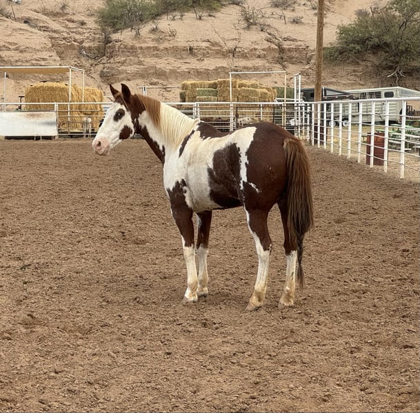 ONLINE AUCTION Place your bids at www.PlatinumEquineAuction.com Starting Bid $3500 Auction ends December 1st, 2024 Need a new saddle? Check out White Rock Saddles on our website or Facebook! Indio is a 11 yr old grade paint gelding he stands 15h exactly. Hes an absolute joy to have, he’s my go to in the roping arena or for the kids to ride down the road. Indio is a finished rope horse and also solid using ranch horse. I’ve been hauling him to jackpots from the number 12s down to the number 7s. He leaves flat, scores like a rock has a great move, he’ll take you to the pay widow. He has the smoothest lope you could ask for and great ranch horse walk. Hes so comfortable to ride outside he travels out like he has to get somewhere, you can ride him all day and enjoy your ride doesn’t matter if it’s working cattle or walking down the road or up in rough country he’s the one you want to be mounted on. He’s safe, safe and sure footed, he’ll take care of his rider doesn’t matter the Place or Environment. He’s easy to be around nothing bothers him he’s been around all the animals on the farm, traffic, flags, tarps, you name it he’s seen it all. He’s a perfect gentleman he’ll stand, saddle, bathe, load the trailer and hauls quite and easy. He’s also the one we use to give the kiddos rides at the parties or at the ranch where we have a youth program called Serna ranch youth leadership program in El Paso Tx where schools bring their students to learn about the farm or cowboy way . Indio has been a joy and he would be a great fit for anyone’s program or family no matter what it is he’s safe and reliable! He’ll stand out anywhere you go. He sells with a 100% guarantee in every way. No vices of any kind Please call Lauren Lara 915-474-5453 with any questions thank you. ONLINE AUCTION Place your bids at www.PlatinumEquineAuction.com Starting Bid $3500 Auction ends December 1st, 2024 Need a new saddle? Check out White Rock Saddles on our website or Facebook!