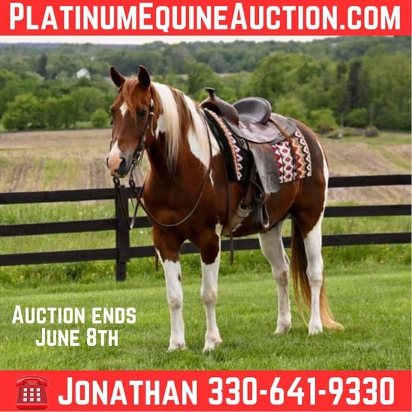 ONLINE AUCTION Place your bids at www.PlatinumEquineAuction.com Starting Bid $3500 Auction ends June 8th, 2025 Need a new saddle? Check out White Rock Saddles on our website or Facebook! Meet Dakota, a 12-year-old grade Quarter Horse gelding standing at 15.2 hands. He’s the total package if you’re looking for a safe, dependable, and experienced trail partner or an easy-going arena ride. Dakota is very gentle, with a kind disposition that makes him kid and beginner safe. He’s been there, done that, and is happy to take things slow and steady. Whether you’re out on the trail or riding in the arena, Dakota is always calm, steady, and willing. He walks, trots, and lopes nicely in the arena with smooth transitions. He has a good stop and backs up well, making him a pleasure to handle. On the trail, he’s confident and calm — traffic safe, not spooky, and happy to lead or follow. He loads, bathes, and clips easily, and stands well for the farrier. Easy to handle and be around in every way. Dakota is the kind of horse the whole family can enjoy. Perfect for someone wanting a no-drama, easy-going gelding who knows his job. Dakota is located in Fredericksburg OH if you think he is a fit for you feel free to reach out to meet him at the farm. For more info contact Jonathan Schlabach 330-641-9330. ONLINE AUCTION Place your bids at www.PlatinumEquineAuction.com Starting Bid $3500 Auction ends June 8th, 2025 Need a new saddle? Check out White Rock Saddles on our website or Facebook!