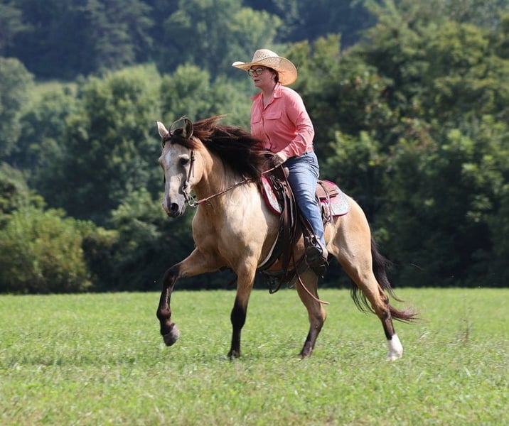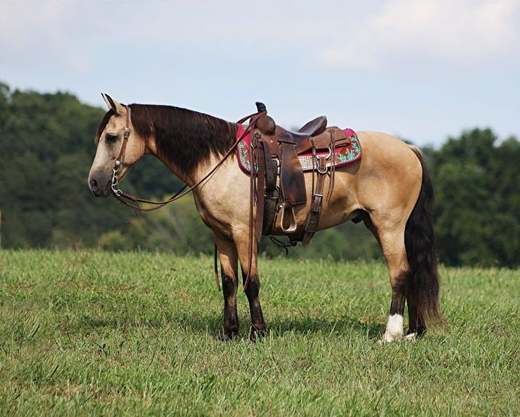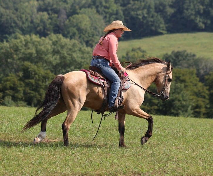 ONLINE AUCTION Place your bids at www.PlatinumEquineAuction.com Starting Bid $3500 Auction ends September 1st, 2024 Need a new saddle? Check out White Rock Saddles on our website or Facebook! Amigo is everyones best friend! And he is not a bad friend to have around… he has a lot of things going for him, such as that beautiful buckskin, coat, that friendly personality, that sweet lope and that big thick mane! He is certainly is a dream come true! Amigo is an 11 year old buckskin quarter horse cross gelding standing around 14.1hh. Amigo has done it all out on the ranch he has pasture roped and doctored sick ones, been hauled to barrel races and rode down the trails! Amigo has been ridden in multiple states from New Mexico to Kentucky. He will cross creeks, ditches, logs and navigate rough rocky areas. He has a nice ground covering walk, smooth jog, a good lope, he reins around anc backs as well! He has been exposed to all kinds of wildlife such as deer or turkey or other animals like cows or dogs and will go anywhere that he is asked too. He has been rode many miles in the mountains of Eastern Kentucky and encountered every obstacle possible on the trail. He will go up or down even the steepest slopes, across deep creeks, over downed trees, and over all types of rough terrain while still being sure footed. If you want to have a good ride and look good on your ride all at the sametime… Amigo is your man!!! Feel free to call Lucky 13 Equine Lysandra 765-717-2041 with any questions. Located in Brodhead, KY. ONLINE AUCTION Place your bids at www.PlatinumEquineAuction.com Starting Bid $3500 Auction ends September 1st, 2024 Need a new saddle? Check out White Rock Saddles on our website or Facebook!