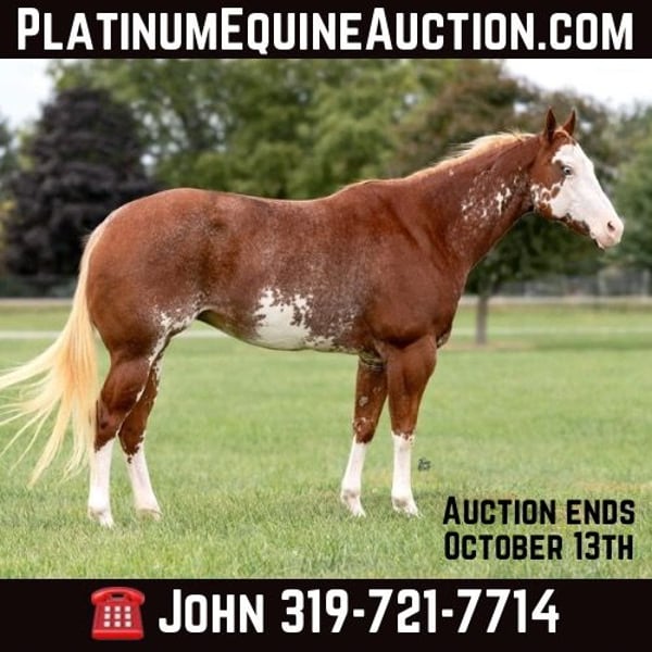 ONLINE AUCTION Place your bids at www.PlatinumEquineAuction.com Starting Bid $3500 Auction ends October 13th, 2024 Need a new saddle? Check out White Rock Saddles on our website or Facebook! Diamond is a stunning 12-year-old registered APHA mare, standing at 14.3 hands tall. She has an eye-catching appearance and an even more impressive resume. Over the years, she has been shown in a variety of disciplines, including youth walk-trot, adult western pleasure, and ranch horse pleasure. In addition, she has won numerous halter classes with children and has been shown in 4-H by multiple young riders. Diamond is a seasoned competitor in open shows as well, and her versatility shines through in her ability to excel in both the show ring and on the trail. She is truly a reliable and gentle mare with no behavioral issues or vices. When it comes to trail riding, Diamond is a dream. She has been on countless camping trips, sometimes lasting all weekend, and never hesitates when encountering obstacles such as water, logs, or ditches. Whether tied to the trailer or out on the trail, she remains calm and well-behaved. Diamond is also parade ready, as she’s carried flags in grand entries without a second thought. Her easygoing temperament makes her a great companion, and she is excellent for routine care such as vaccinations, worming, and farrier work. What truly sets Diamond apart is her impeccable bloodlines and extensive professional training. She responds beautifully to leg cues and has a solid one-hand neck rein, making her a pleasure to ride for all skill levels. In addition to her show and trail experience, she is sound and ready to breed if you’re looking to add quality to your breeding program. Whether you need a family horse, a show partner, or a reliable trail companion, Diamond is the complete package. Don’t miss out on this wonderful mare who can do it all. Located in Lisbon, IA. Contact John McPhail 319-721-7714. ONLINE AUCTION Place your bids at www.PlatinumEquineAuction.com Starting Bid $3500 Auction ends October 13th, 2024 Need a new saddle? Check out White Rock Saddles on our website or Facebook!