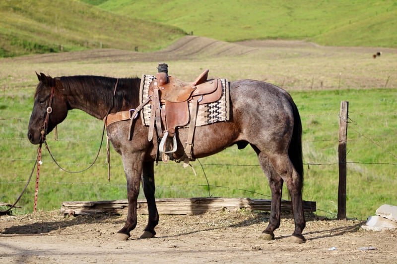 "AVAILABLE ON ONLINE HORSE AUCTION AT www DOT PlatinumEquineAuction DOT com BIDDING OPEN NOW thru SUNDAY | MARCH 15TH! *Final price will be determined on auction site* CONSIGNOR CONTACT INFO: Cheyenne Rey 831-537-8746 LOCATION: Bitterwater, CA Banker is a 14-year-old blue roan gelding. He stands 14.3HH and is large-framed, built how you would want one. Thick bone and wide feet. Banker is a true caretaker. He is safe for anyone, relaxed and easygoing always. He is super simple to handle and ride, easily making him the best match for any level to get along with. He’s been used as a dude string horse, making him tolerant to uneducated riders and handlers! He is alert and ready under saddle but has no spook, bolt, buck, or rear ever. He’s traveled down trails and roads with ease. He’s been seasoned to busy streets full of cyclists, pedestrians, and vehicles. Banker is sure-footed and crosses anything without hesitation. He’s been through deep waters, narrow bridges, and windy trails. Banker has a more whoa than go pace but is by no means lazy; he is comfortable to ride. Banker does great with time off and has zero silly business; he will never act different with days or weeks off. He is also just as simple in the arena. He W-T-L good circles, knows his leads, and will collect lightly at the poll. He has a good stop and knows the cue “whoa”. Banker stands for tacking, bathes well, and is good with his feet. Banker has zero issues and would be great for someone wanting a zero-nonsense, easygoing gelding that you can get on anytime with confidence knowing you don’t have to do any work. Just get on and enjoy your time horseback! Banker is located in Bitterwater, CA. For more info, contact Cheyenne at 831-537-8746.