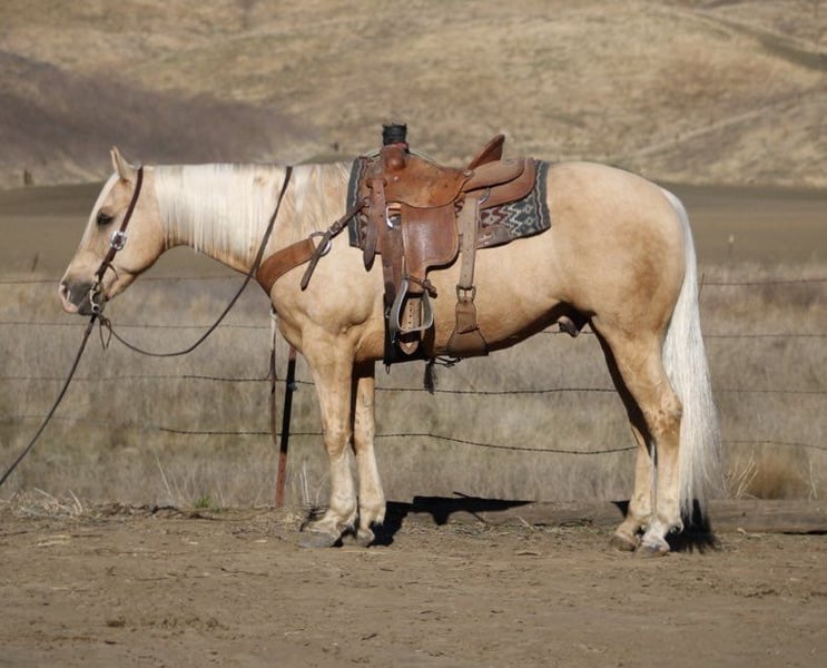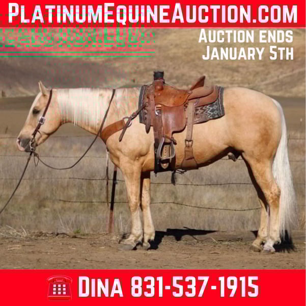 ONLINE AUCTION Place your bids at www.PlatinumEquineAuction.com Starting Bid $3500 Auction ends January 5th, 2024 Need a new saddle? Check out White Rock Saddles on our website or Facebook! Start 2025 out right with this 12-year-old stunning palomino gelding who embodies kindness and calmness in every stride. Standing at a sturdy 15 hands, he boasts an eye-catching sheen that glimmers like sunlight filtering through leaves. His disposition is matched only by his unmatched versatility; whether you’re navigating bustling streets with friends or savoring peaceful moments on scenic trails, unwavering confidence makes him the ultimate companion. This equine marvel has tackled countless obstacles deep waters, narrow paths lined with trees, and wildlife encounters all with gentle assurance as if they were mere bumps along the way. He maneuvers through swinging balls and flying tarps and shrugs off distractions like cars or even semis honking as if they were just another day at work. He is a good ranch horse to gather on and has branded cattle he’s is always ready to work. Professionally trained in the arena, he showcases flawless circles paired with smooth transitions that glide effortlessly into motion a true testament to his grace. Cody proves time and again that he’s not just any horse; he is an extraordinary boy capable of nurturing confidence in those lucky enough to ride him. Polite during vet visits and great for the farrier. He loads and hauls with ease ties well and easy to tacks up. Cody loves ranch life and thrives out on the trails. Cody enjoys being out in a pasture but will stall as well and really enjoys turnouts. He loads and hauls well. Cody is one of those horses that truly likes having a serine setting he truly enjoys the quiet life. He is a horse that likes ranch work. Cody has been great here on the ranch and he will enjoy continuing the ranch and trails with his new family. Cody is suited for intermediate beginners to seasoned riders he is a great choice for a knowledgeable horse family. Please contact Longhorn Ranch located in Paicines, CA to come meet Cody call Dina @ 831-537-1915. ONLINE AUCTION Place your bids at www.PlatinumEquineAuction.com Starting Bid $3500 Auction ends January 5th, 2024 Need a new saddle? Check out White Rock Saddles on our website or Facebook!
